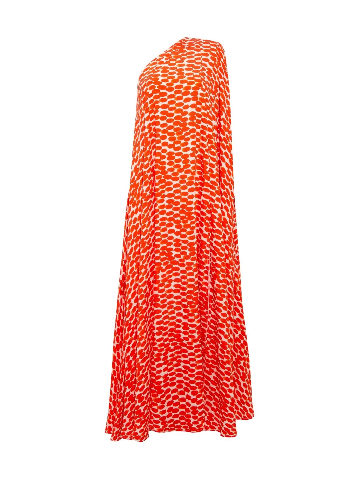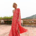 Effortlessly chic, this one-shoulder maxi dress features the same red and off-white polka-dot print in a soft, comfortable fabric. The relaxed silhouette and pocket details create a balance of elegance and ease, making it ideal for everyday sophistication.