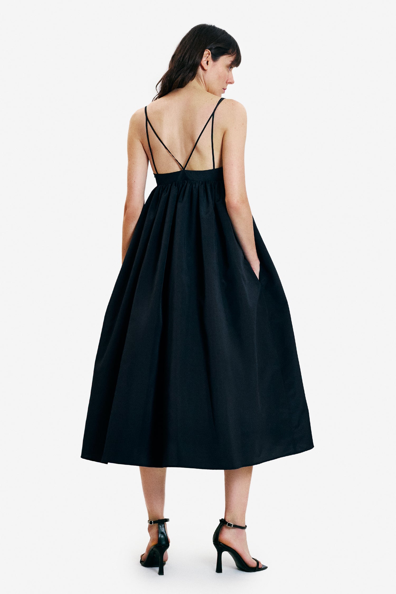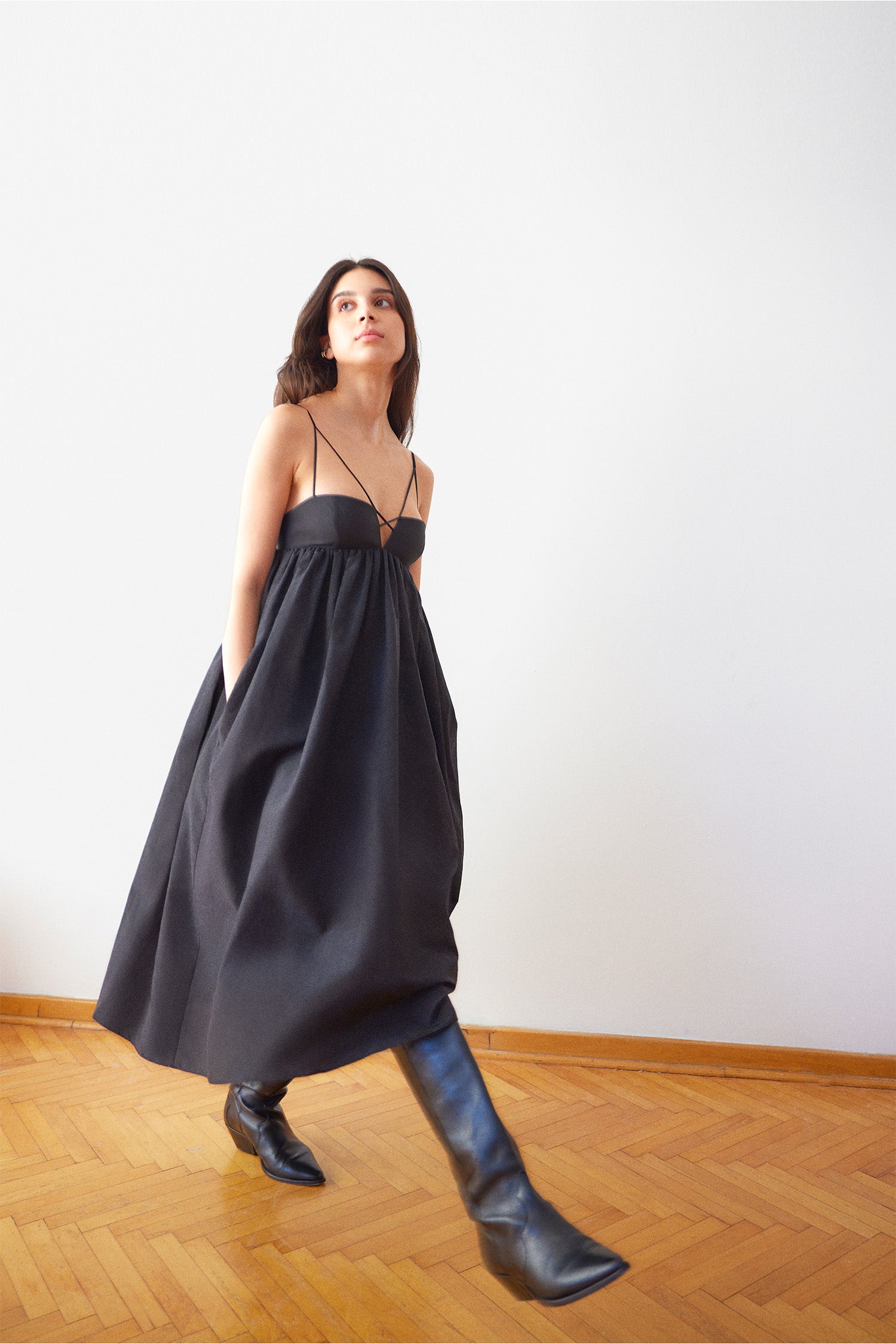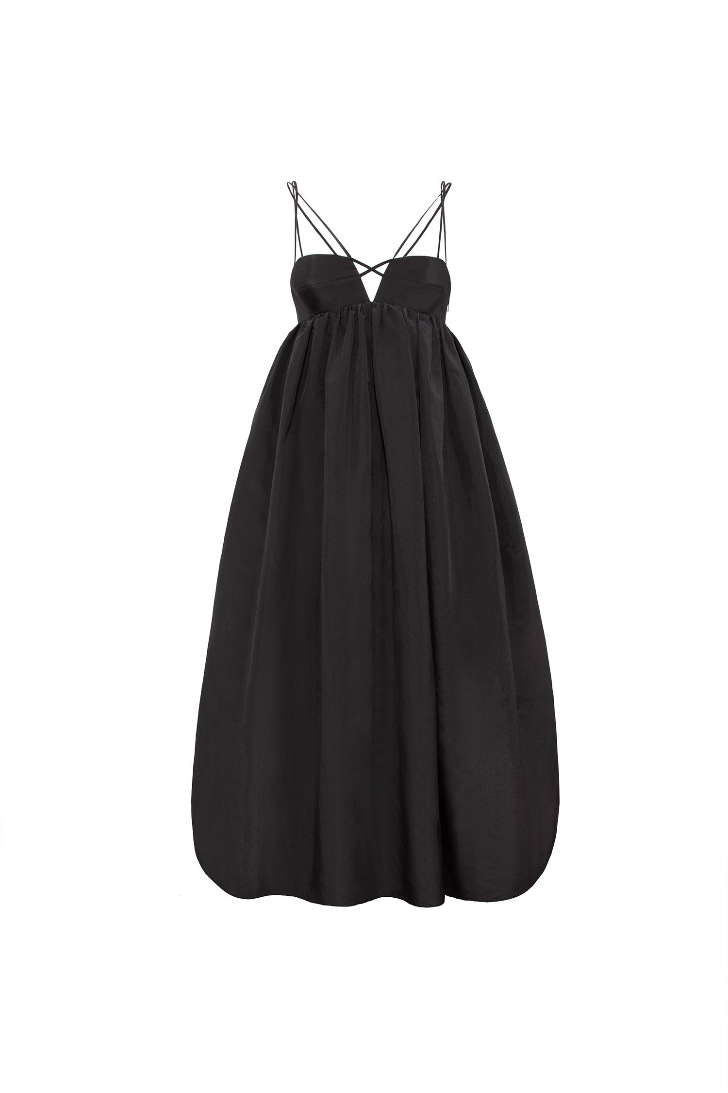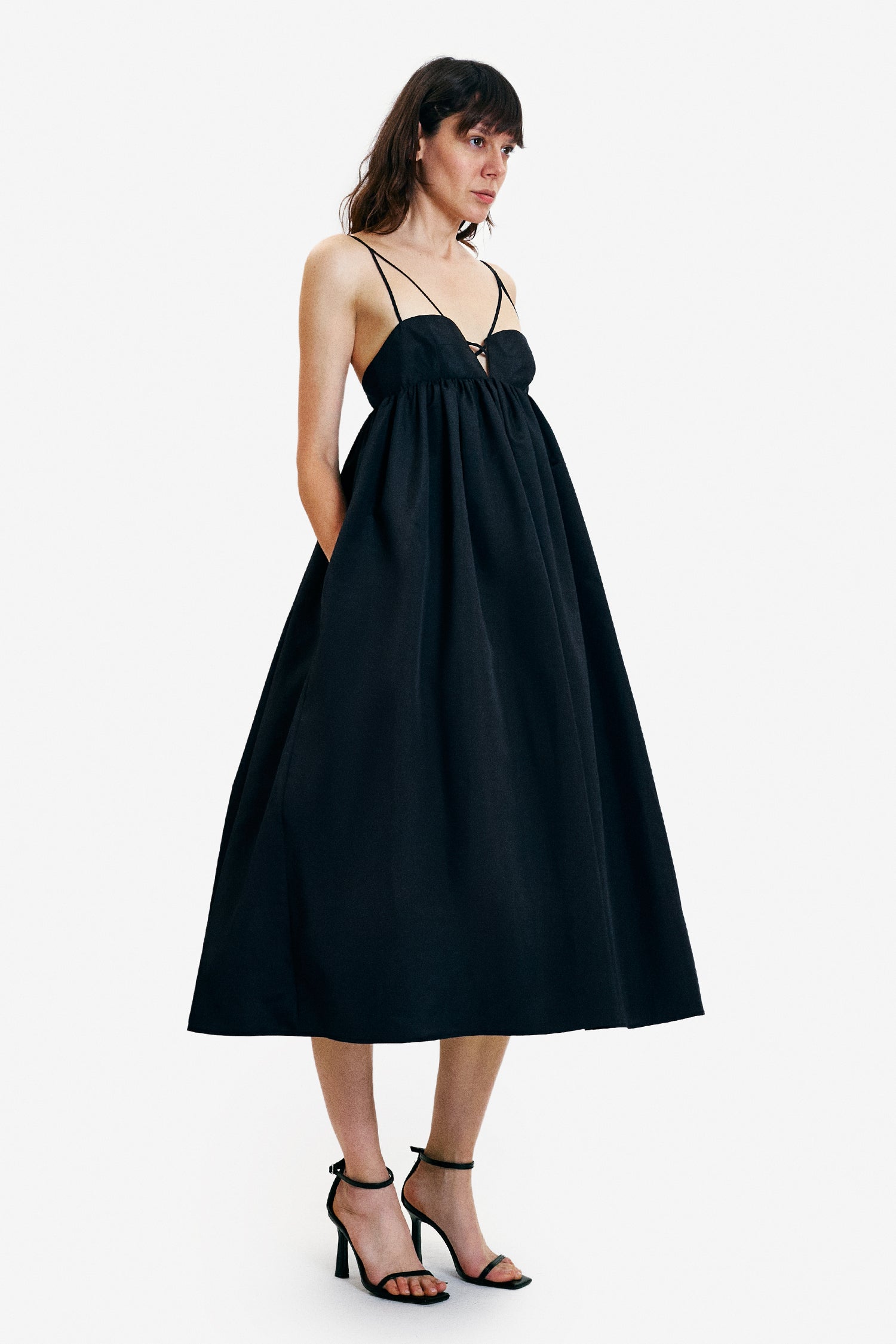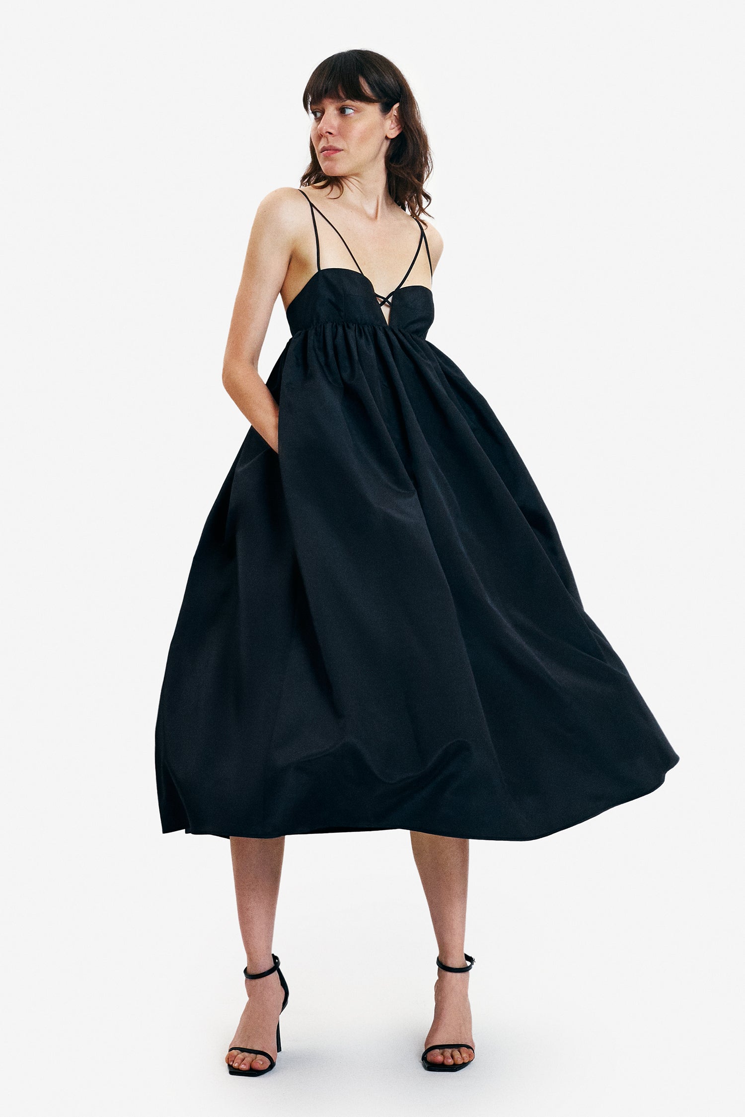 Be bold and stand out in the Emilio Midi Dress! Featuring geometric panels, a daring cutout at the bust, and a full, ruffled skirt, this dress will elevate your style game. Made from luxurious taffeta and supported by an organza-lined inner skirt, this midi dress is perfect for taking risks and making a statement.