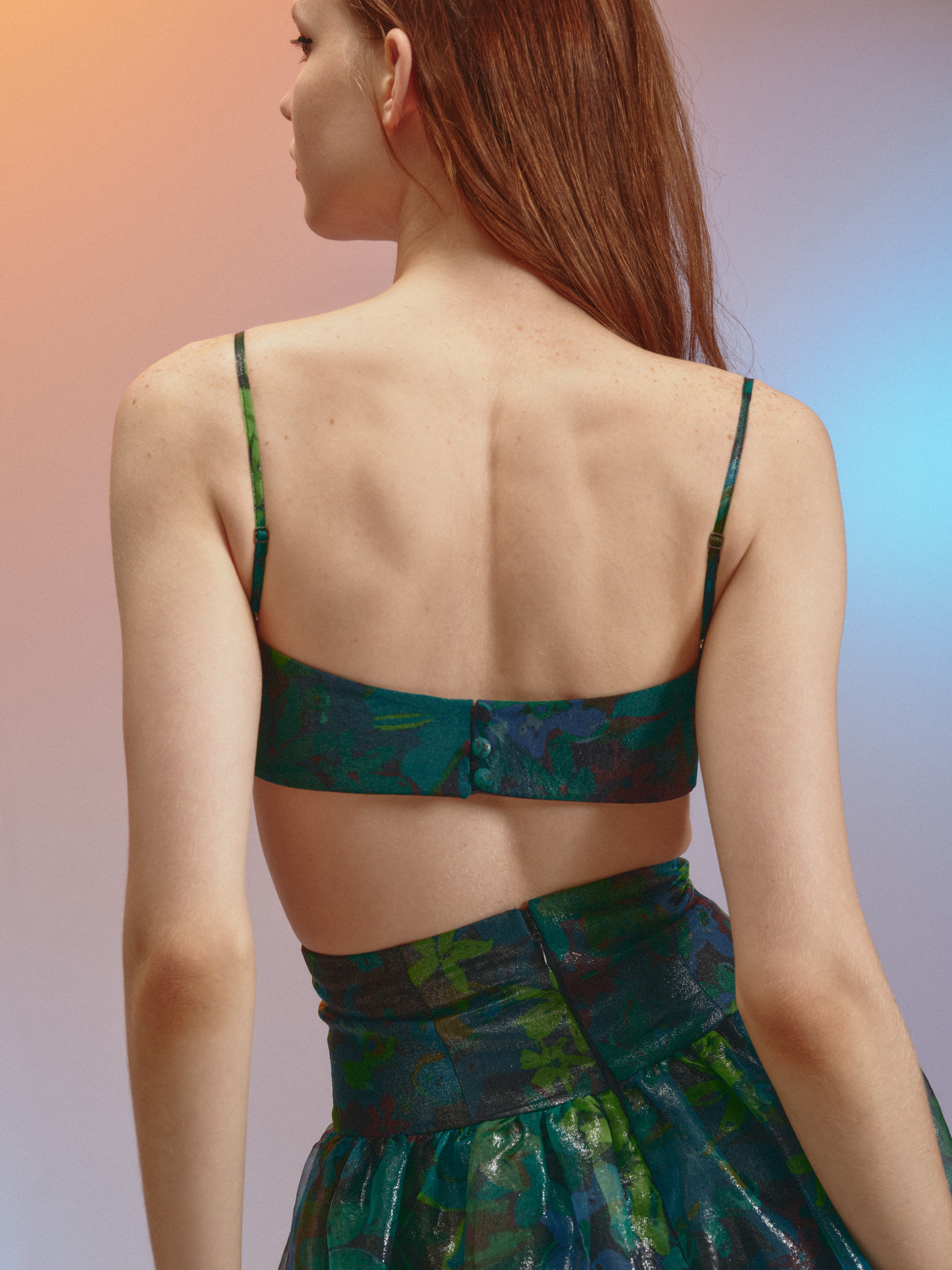 The Fia Top is designed with adjustable organza shoulder straps for a secure and comfortable fit. Its balconette style offers a flattering bust shape. The back features a clip closure for easy wear. Elevate your style with this versatile and chic top.