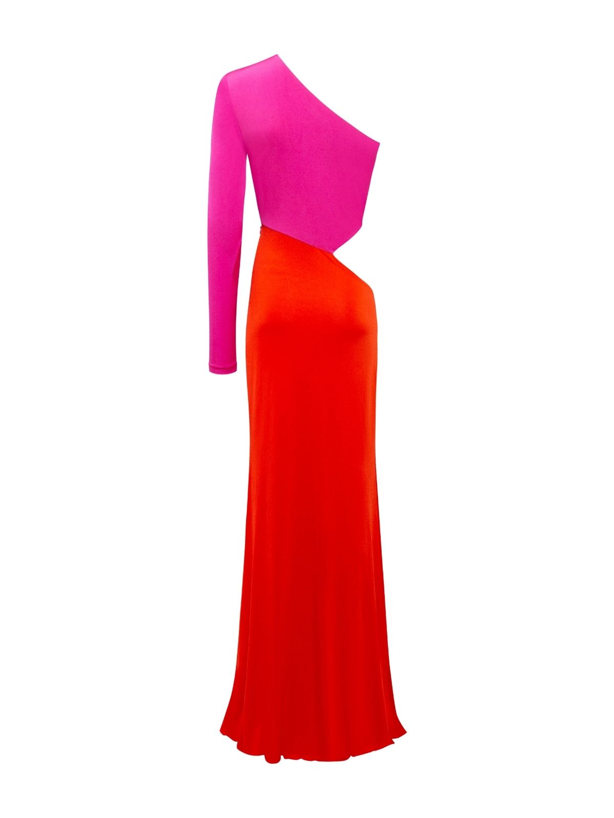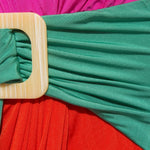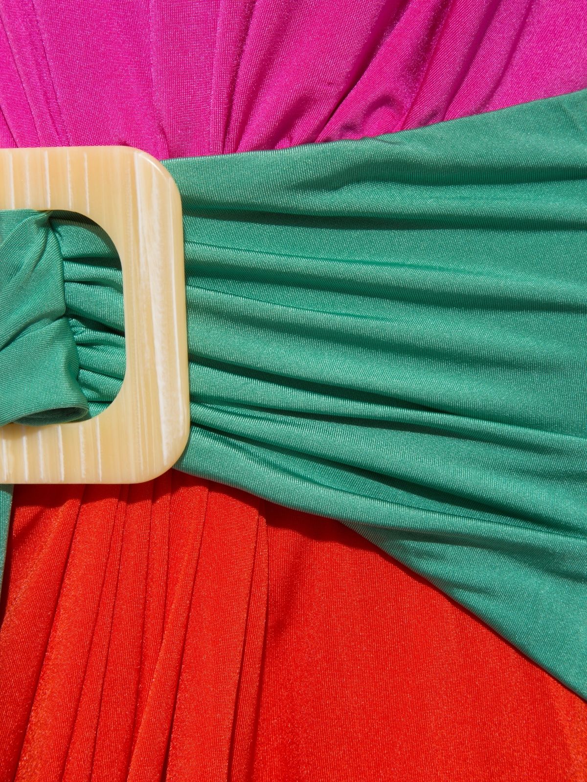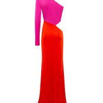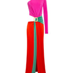 Lola long jersey dress redefines modern elegance with its bold three-color, three-piece design. Crafted from soft, fluid, and flexible jersey fabric, it offers a beautifully elongated silhouette that moves effortlessly with the body. Featuring short sleeves and a coordinating shawl for added versatility, this striking yet comfortable style delivers refined impact for standout occasions.