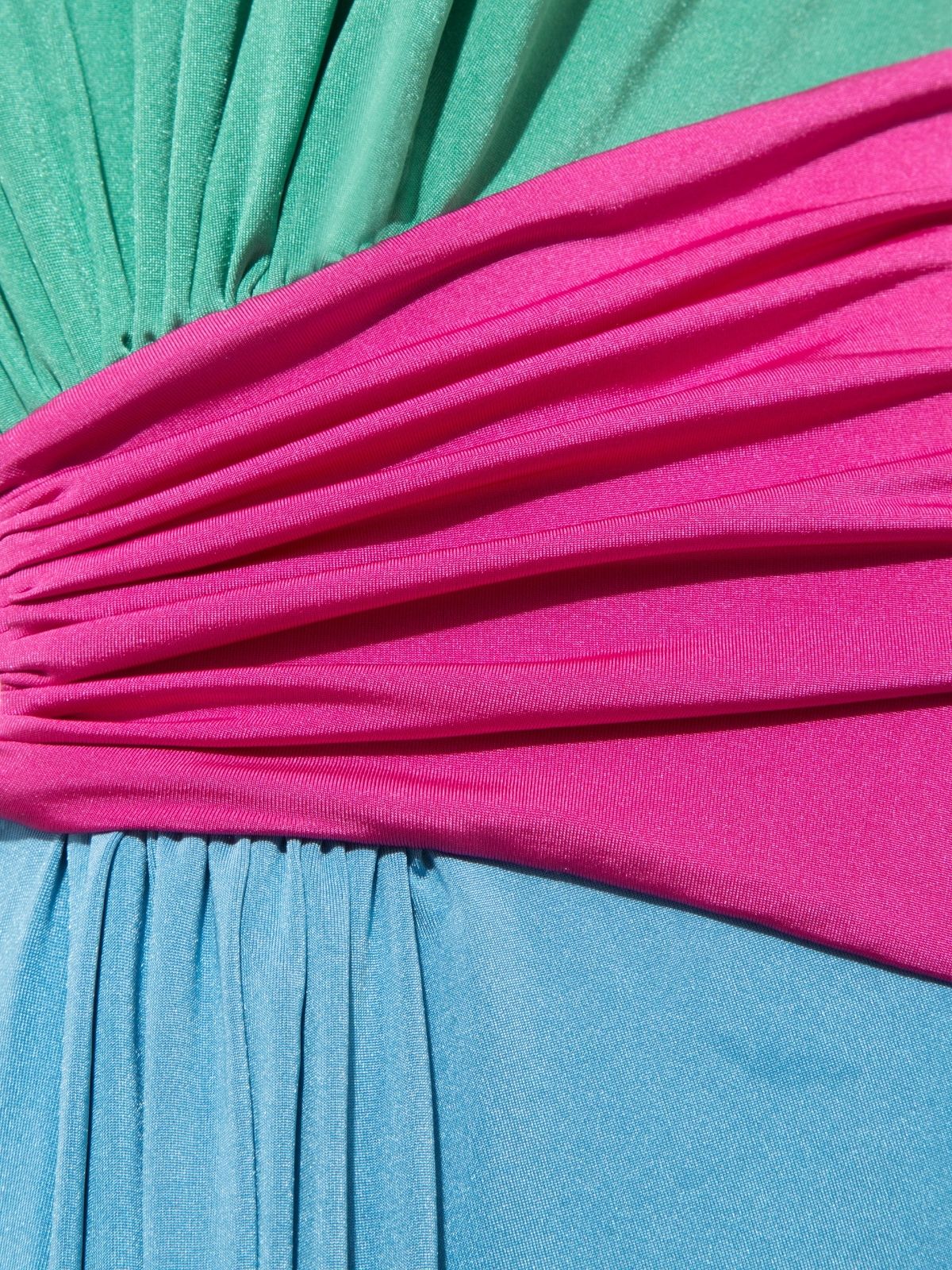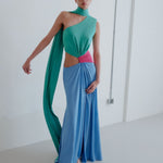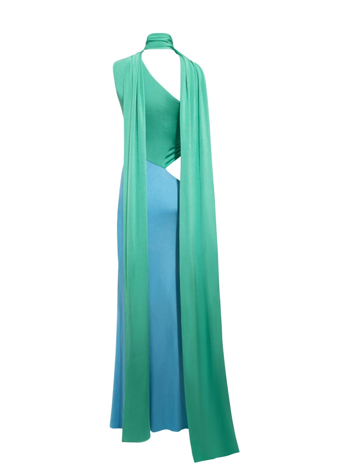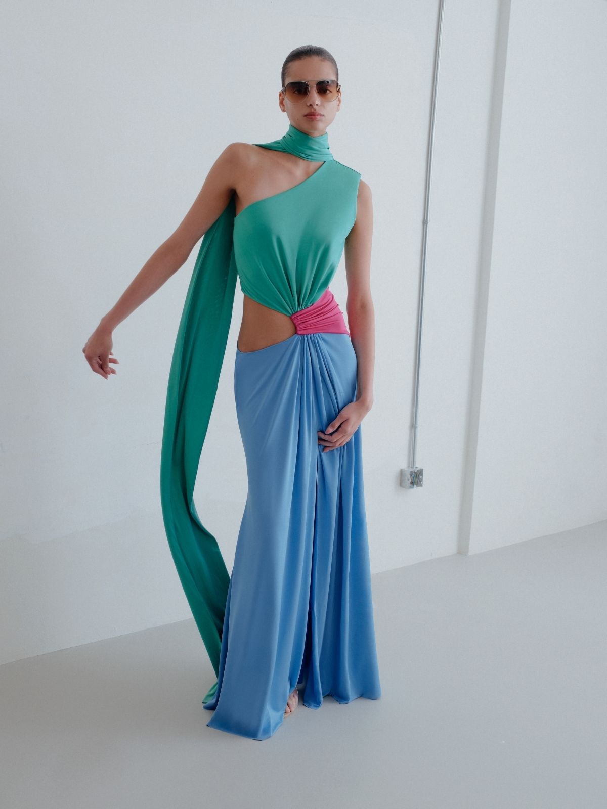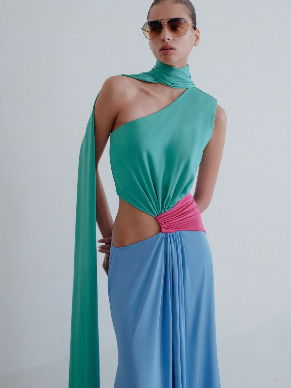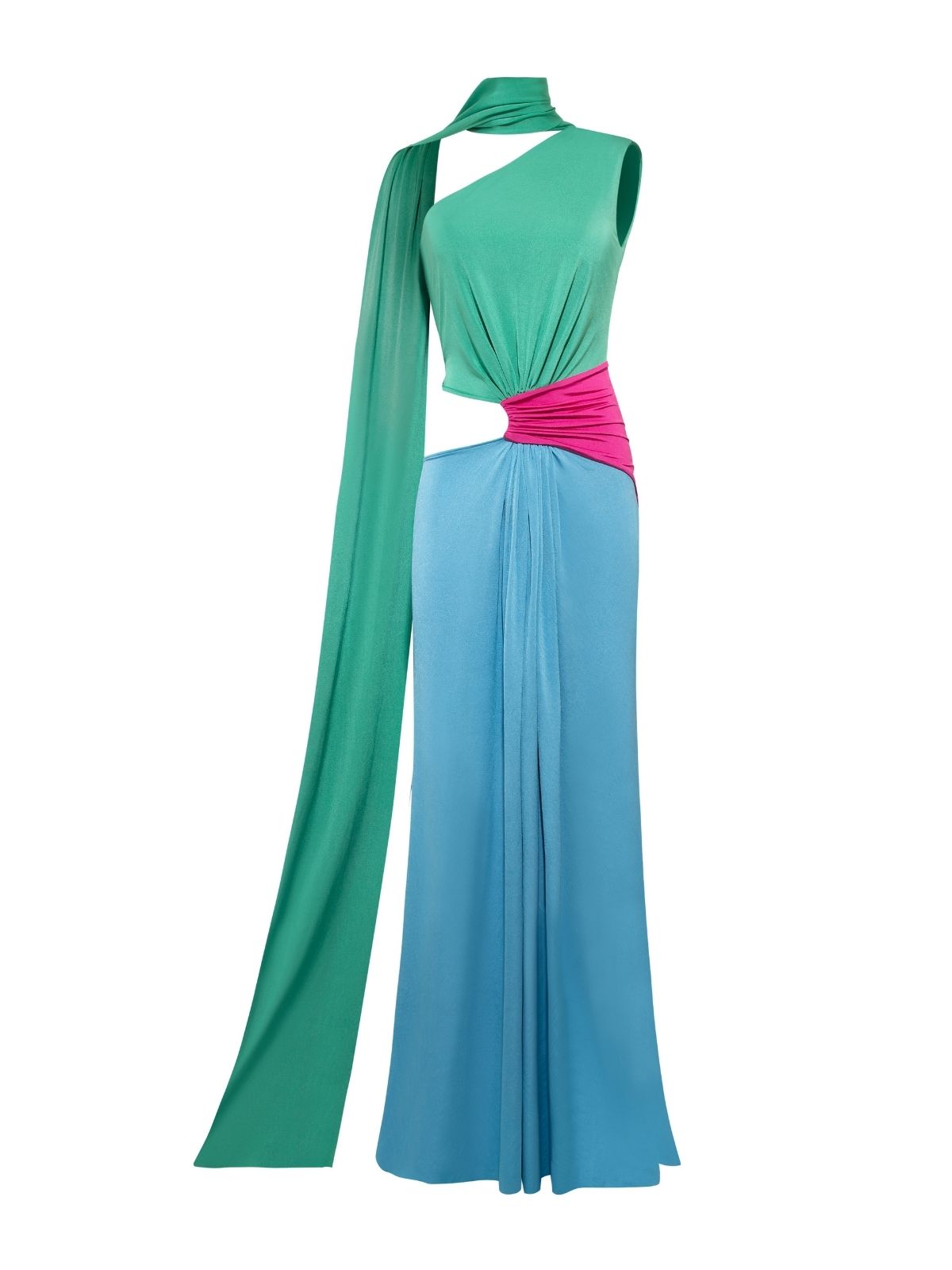 Leila Maxi dress captures modern sophistication with its striking three-color composition in blue, pink, and green. Crafted from soft, fluid, and flexible jersey fabric, it gently contours the body while allowing effortless movement. Designed with a floor-length silhouette and a distinctive waist cut-out detail, it balances bold design with refined elegance—perfect for elevated, statement occasions.