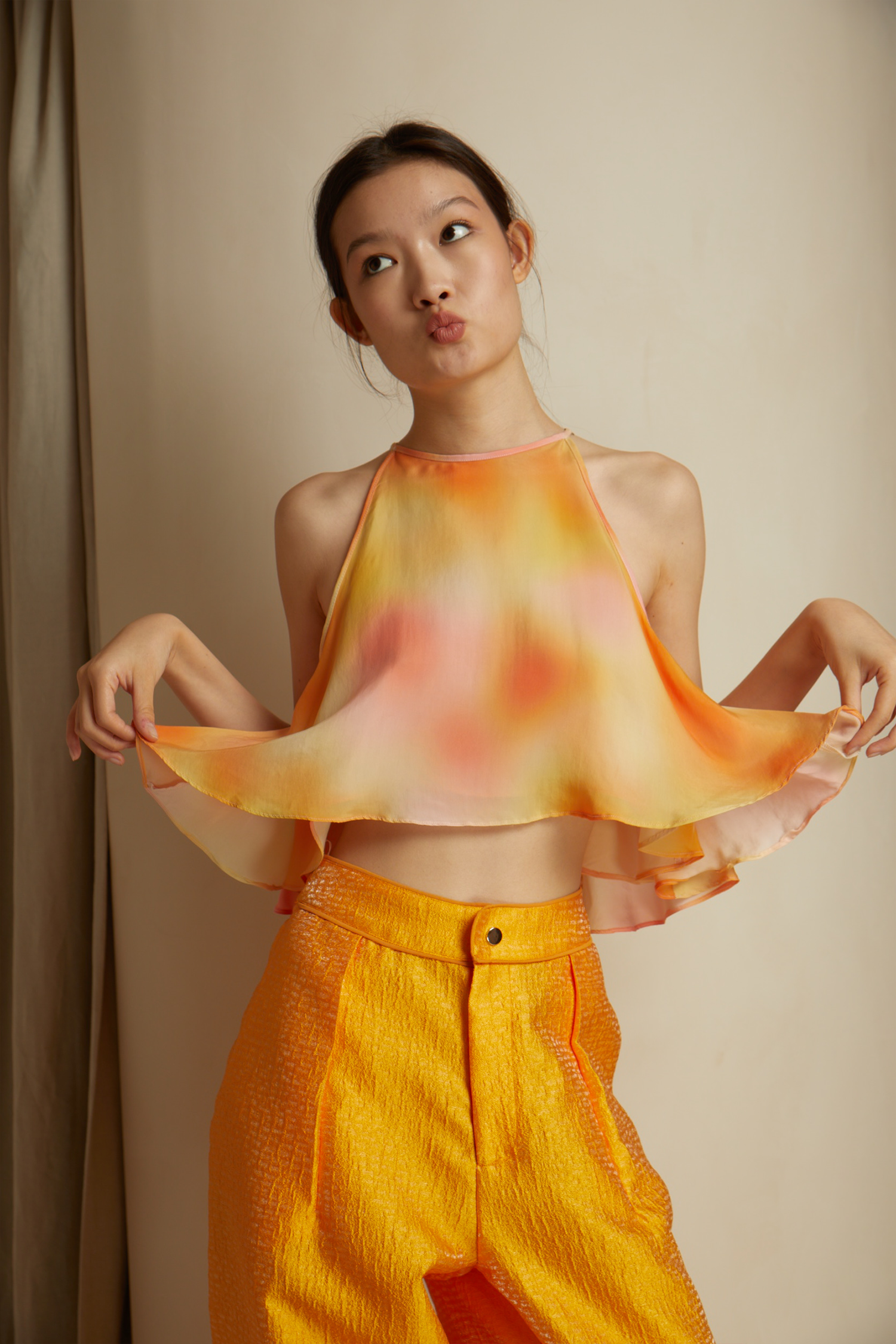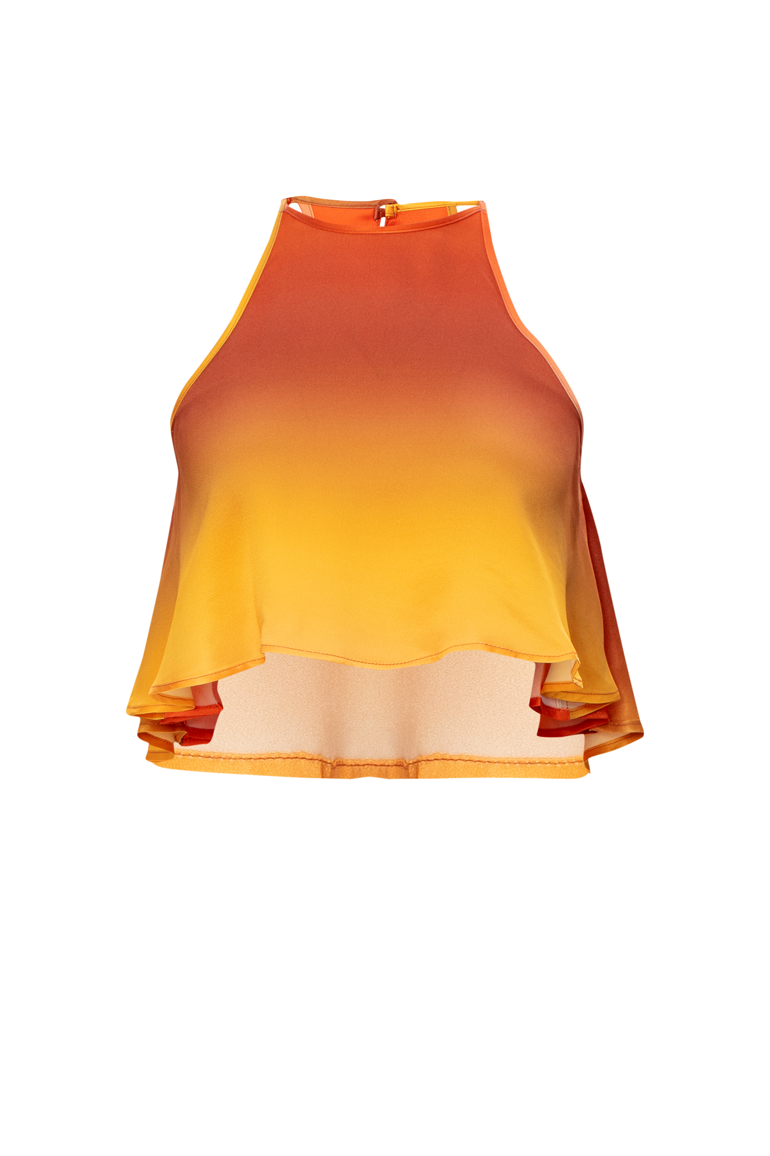 Elevate your elegance with our Lina Top. Featuring a halter neckline and delicate volan finish, this top exudes luxury. The astar-free design and button closure at the neck provide a refined, sophisticated touch. Upgrade your wardrobe with this exclusive piece.