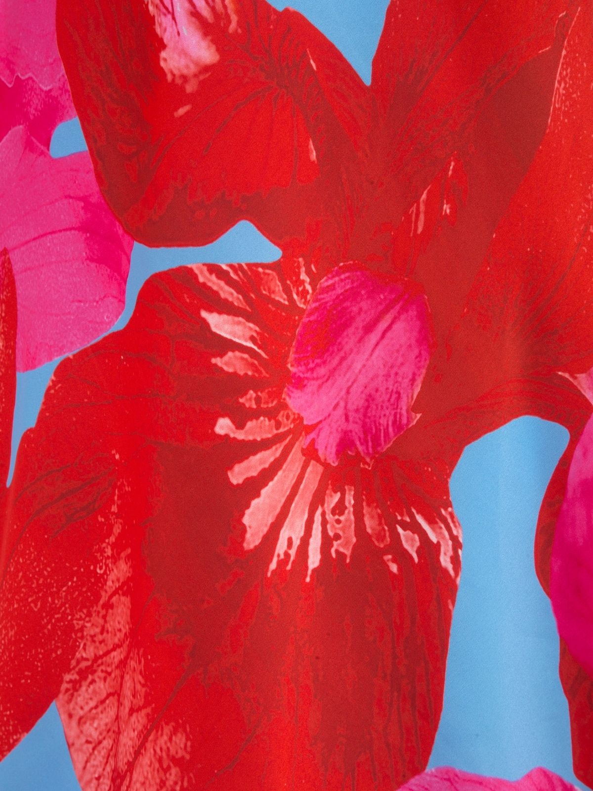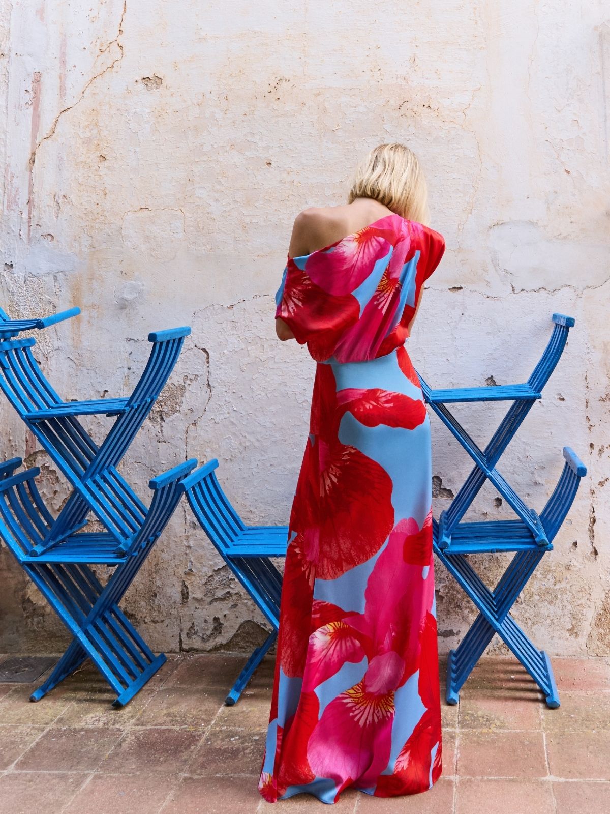 Elegant and softly expressive, this one-shoulder maxi dress features a blue base adorned with delicate pink floral motifs. The pleated front adds gentle movement and texture, while the single-shoulder silhouette creates a refined and modern line.
