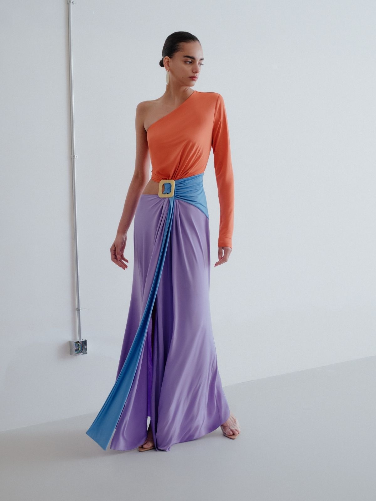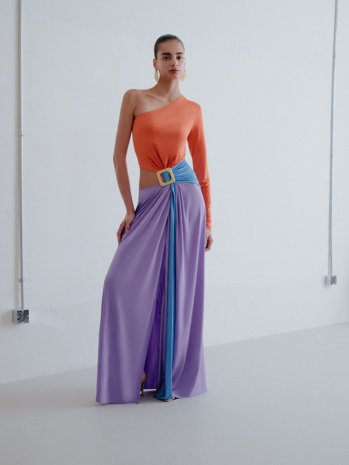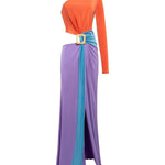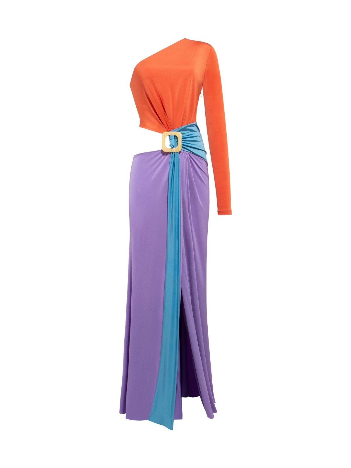 The Lola Maxi Jersey Dress blends modern elegance with bold design. Crafted from soft, fluid jersey fabric, it features a striking three-color composition, a sophisticated one-shoulder silhouette, and a waist cut-out detail accented with a statement buckle. Effortlessly chic and comfortable, it’s the perfect choice for standout occasions.