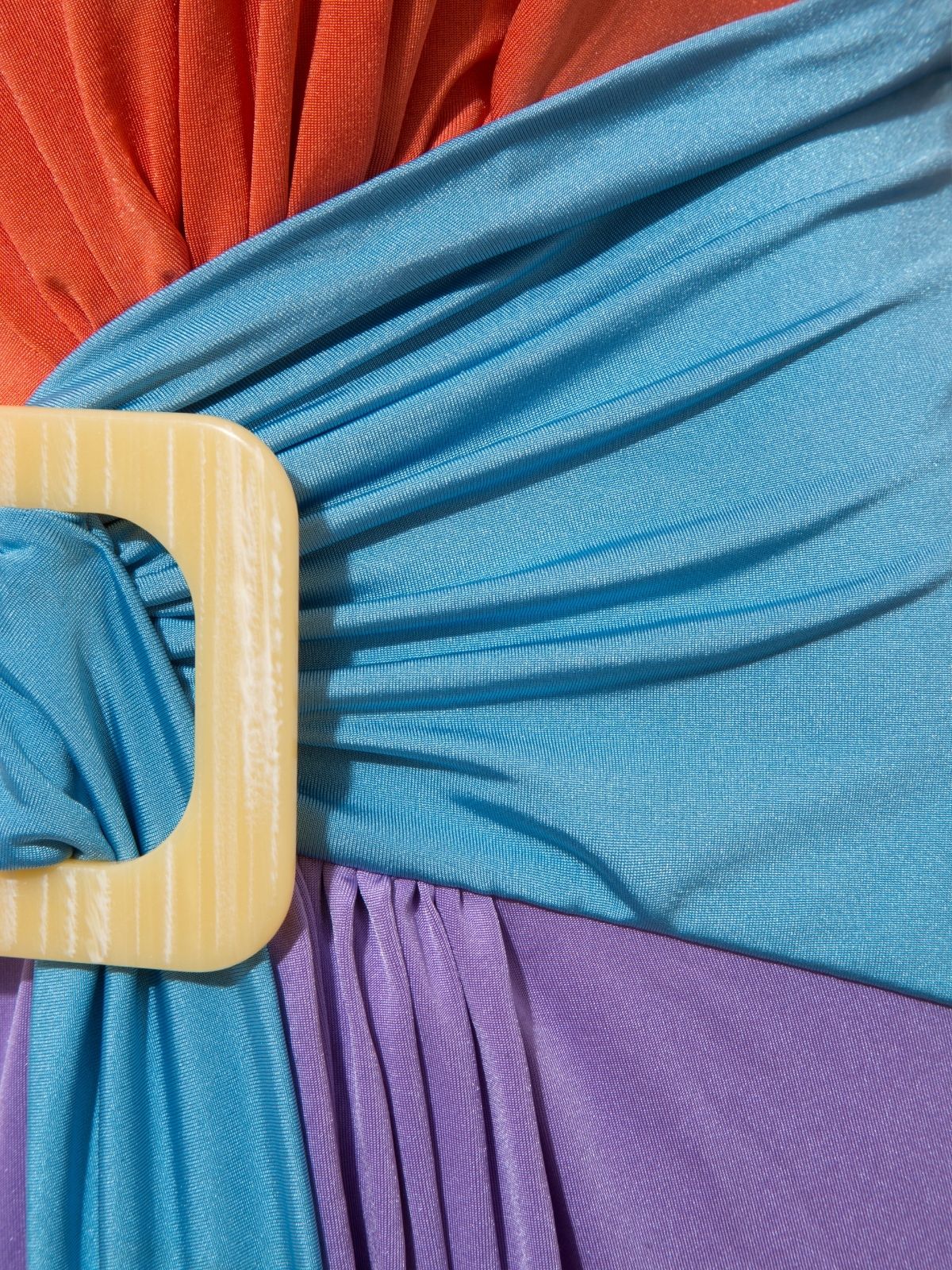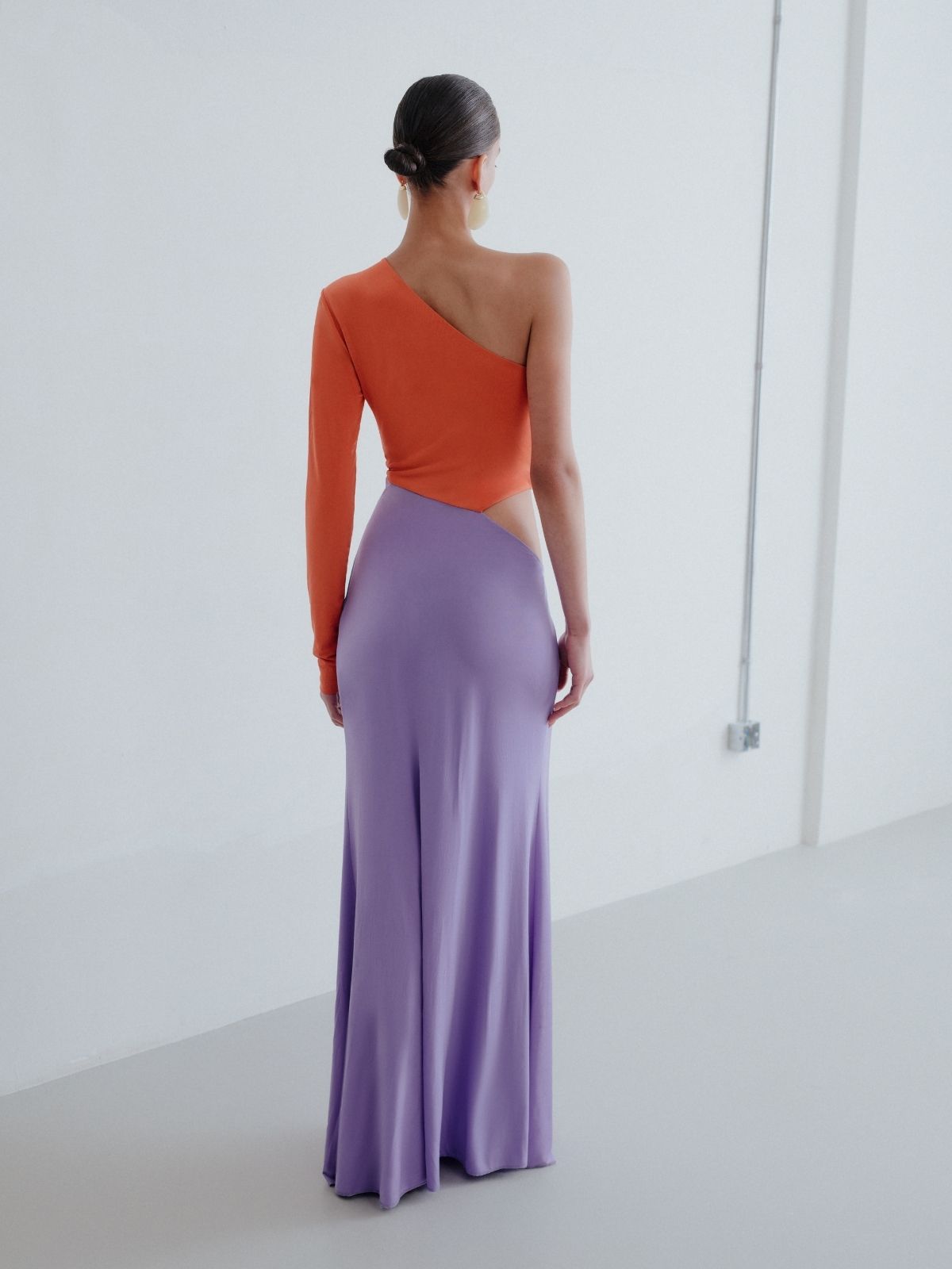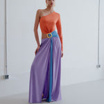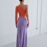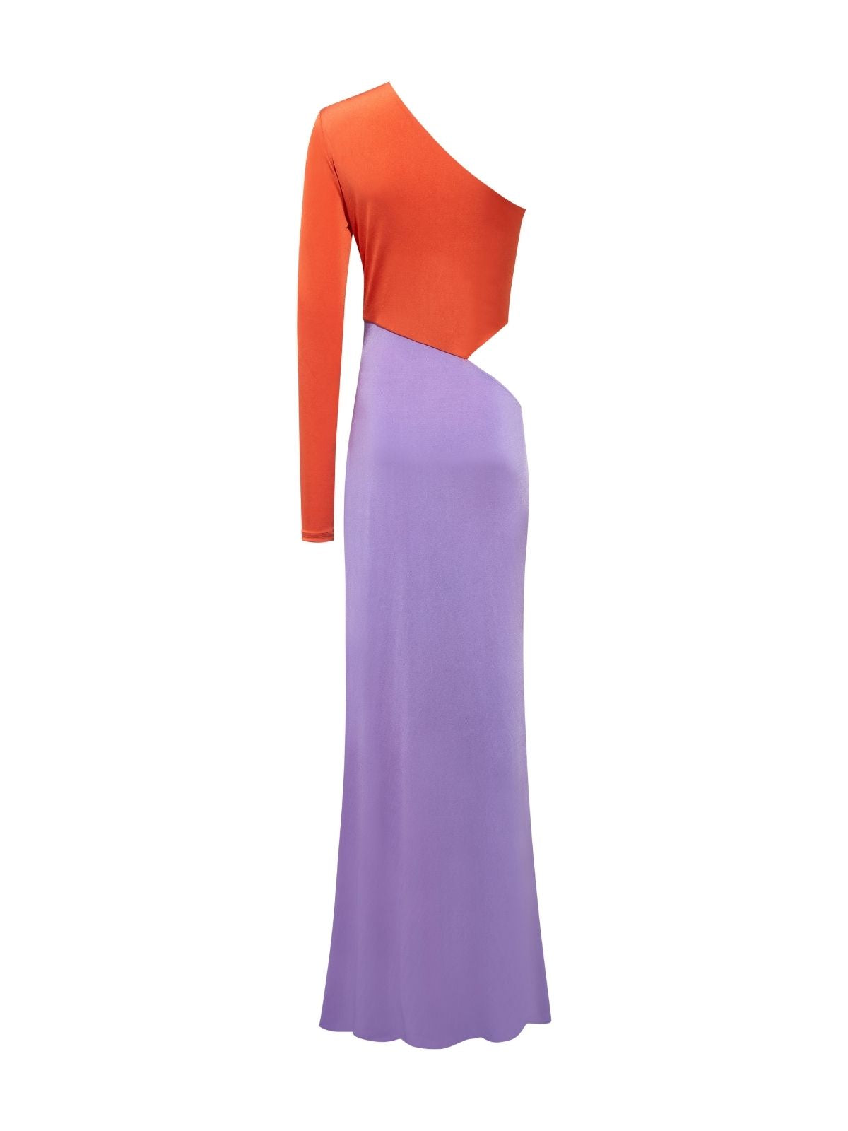 The Lola Maxi Jersey Dress blends modern elegance with bold design. Crafted from soft, fluid jersey fabric, it features a striking three-color composition, a sophisticated one-shoulder silhouette, and a waist cut-out detail accented with a statement buckle. Effortlessly chic and comfortable, it’s the perfect choice for standout occasions.