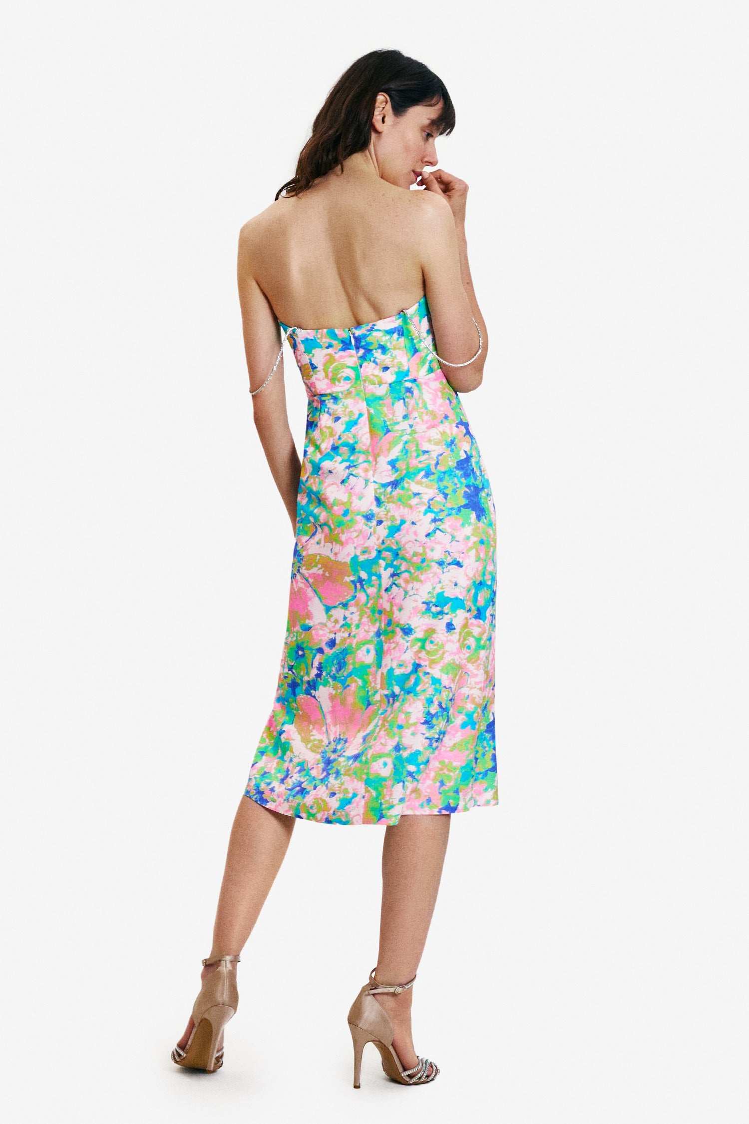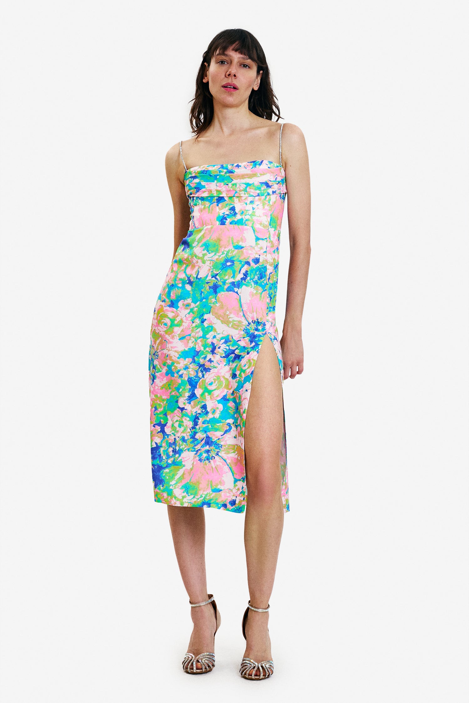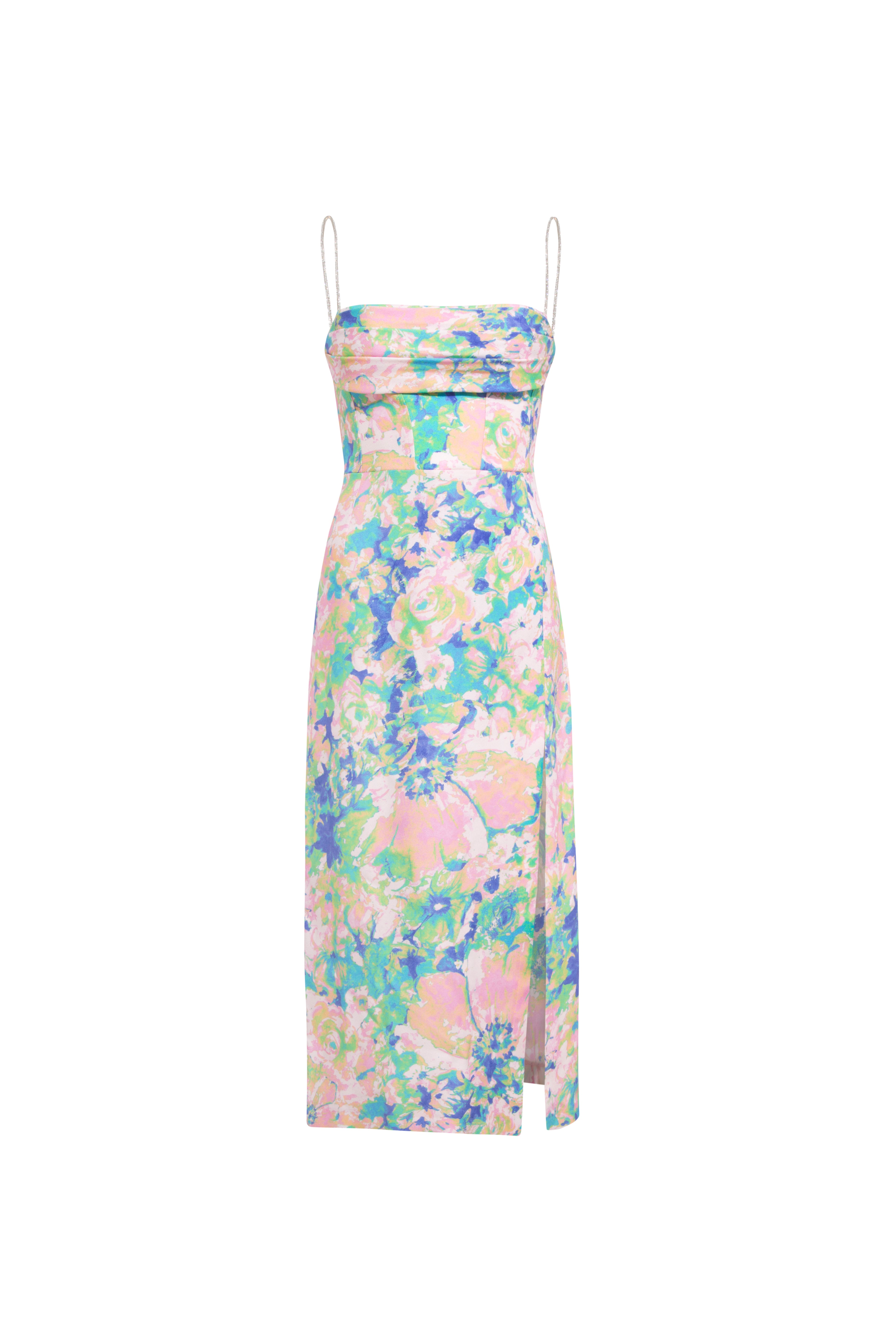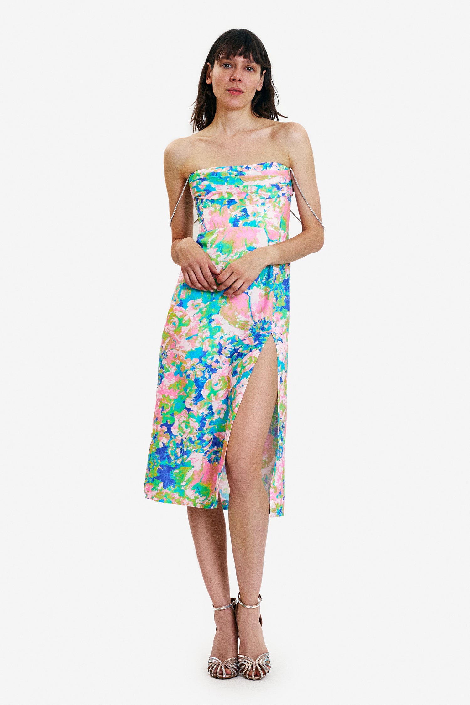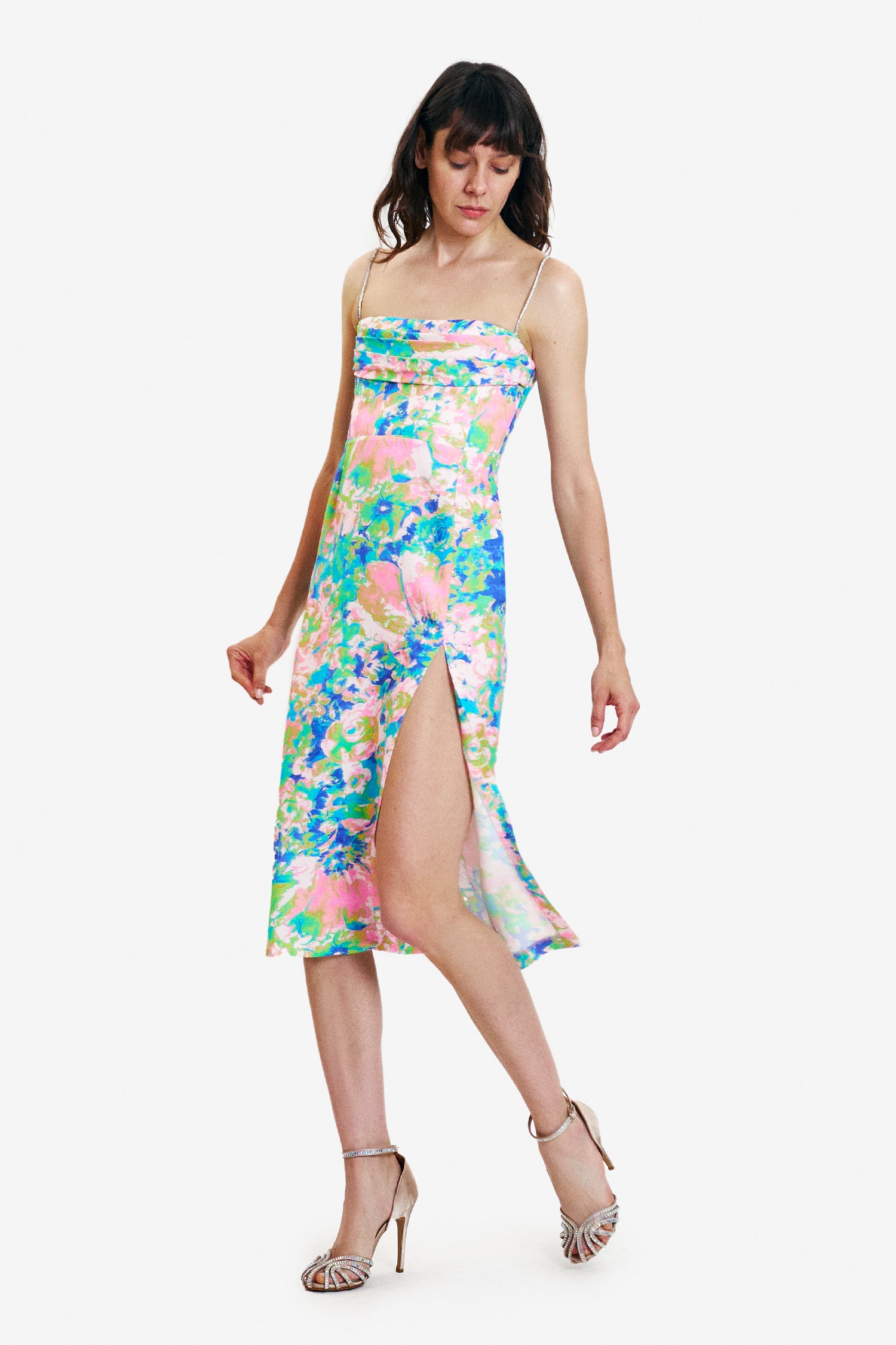 Looking for the perfect dress for a night out? Look no further than our Luisa Dress! With its delicate spaghetti metal straps and midi length, this dress will keep you cool and comfortable. The deep side slit and straight fit add a touch of elegance, while the ruched bodice flatters your figure. Don't miss out on this must-have dress! elegant spaghetti straps are adorned with stone details.