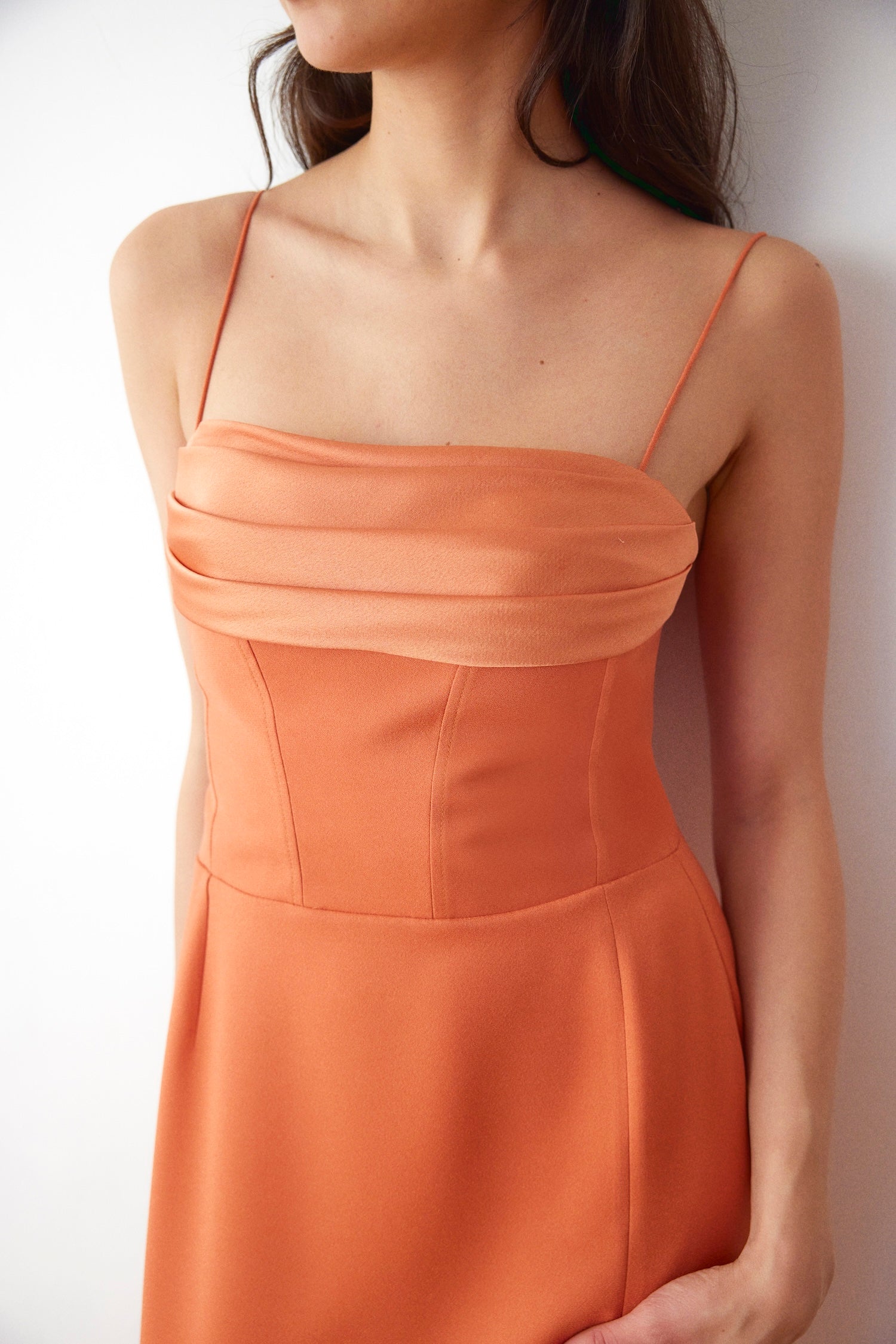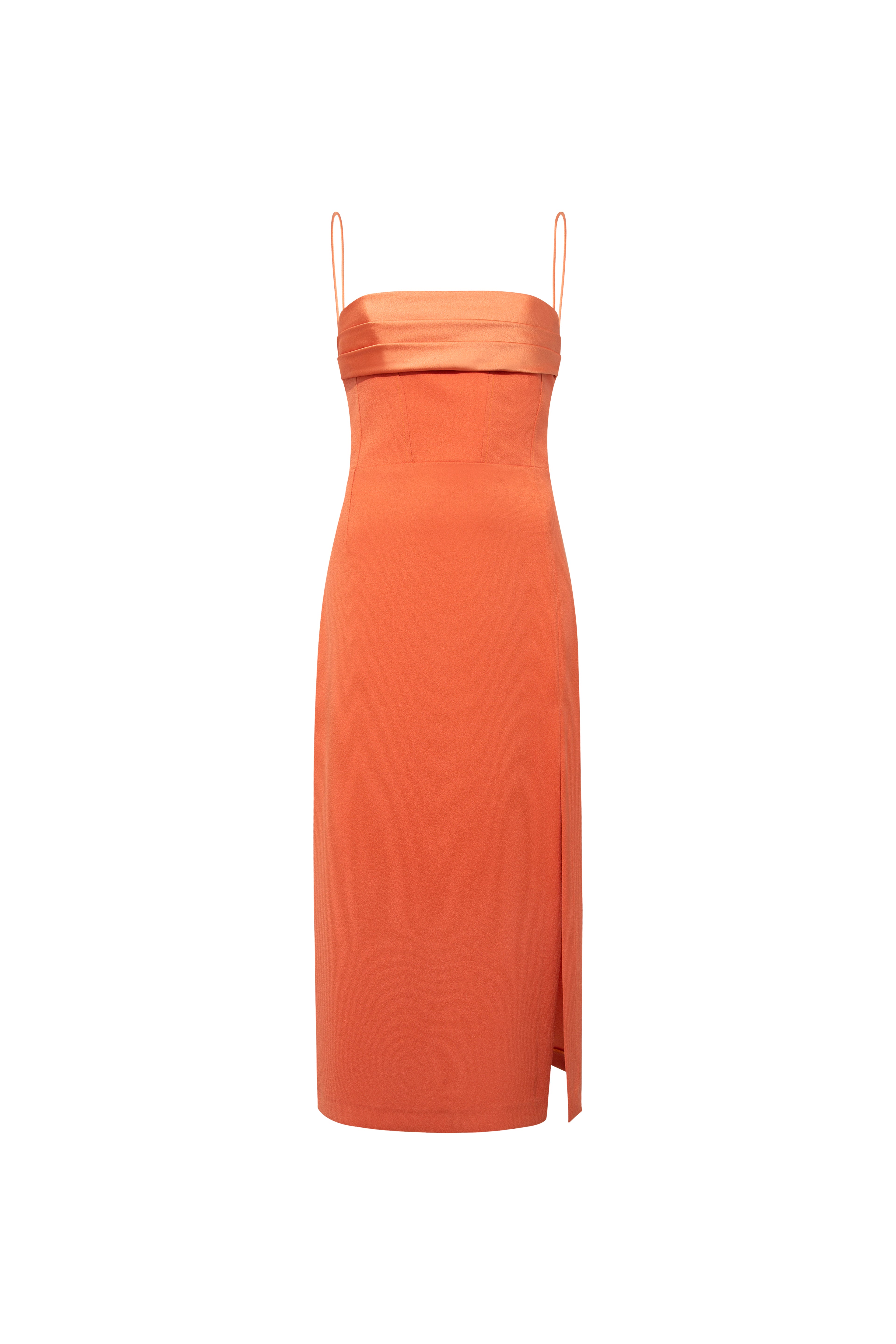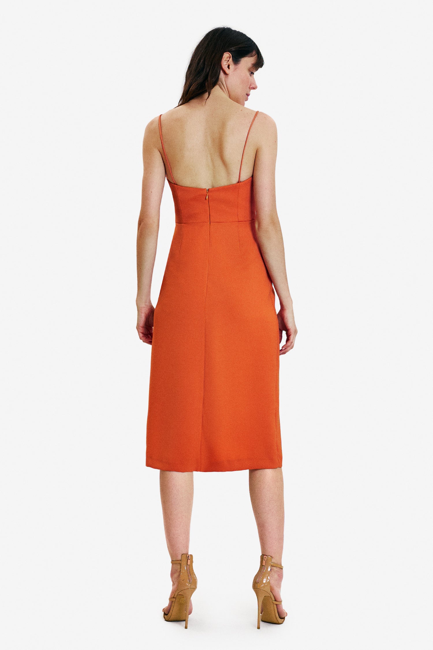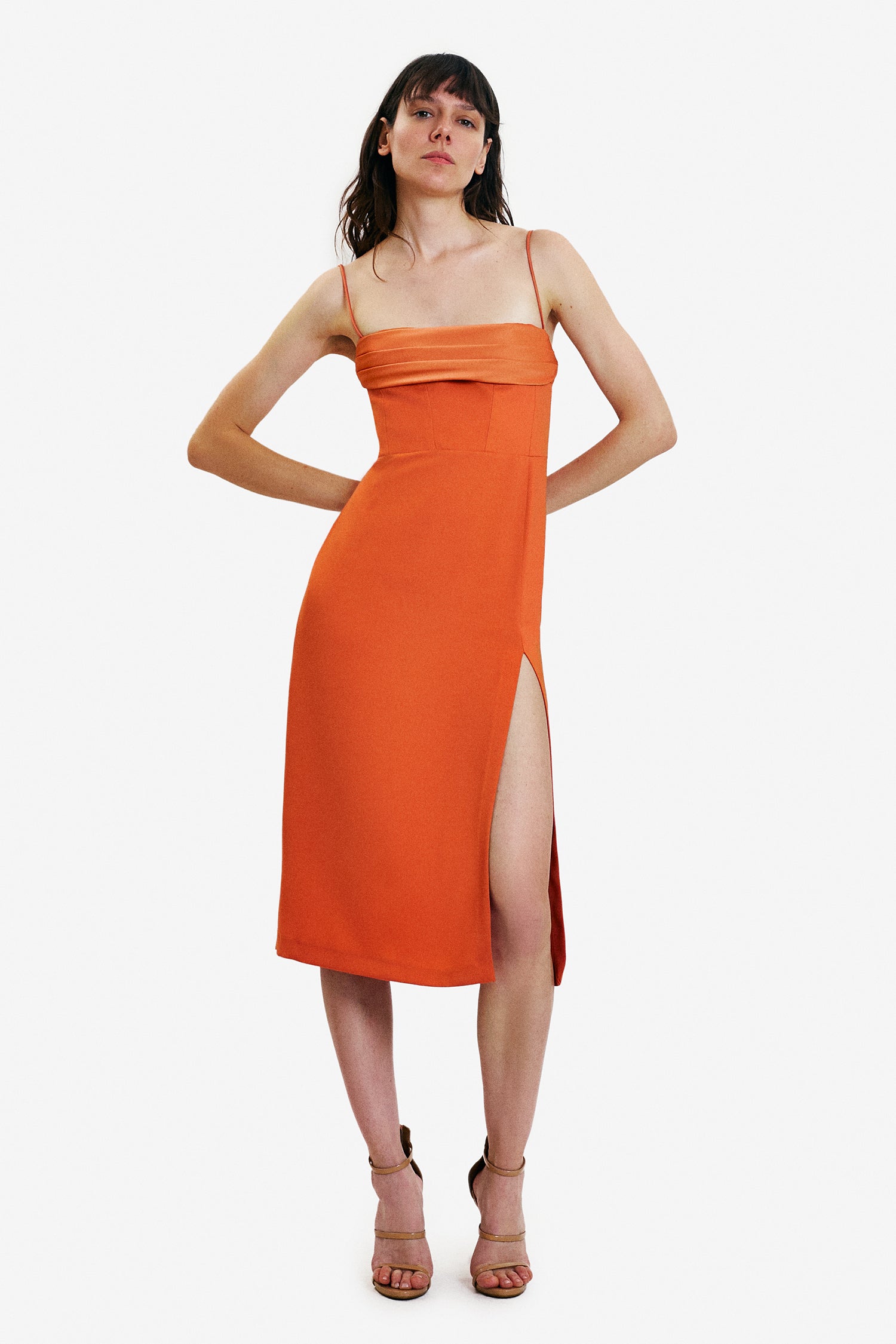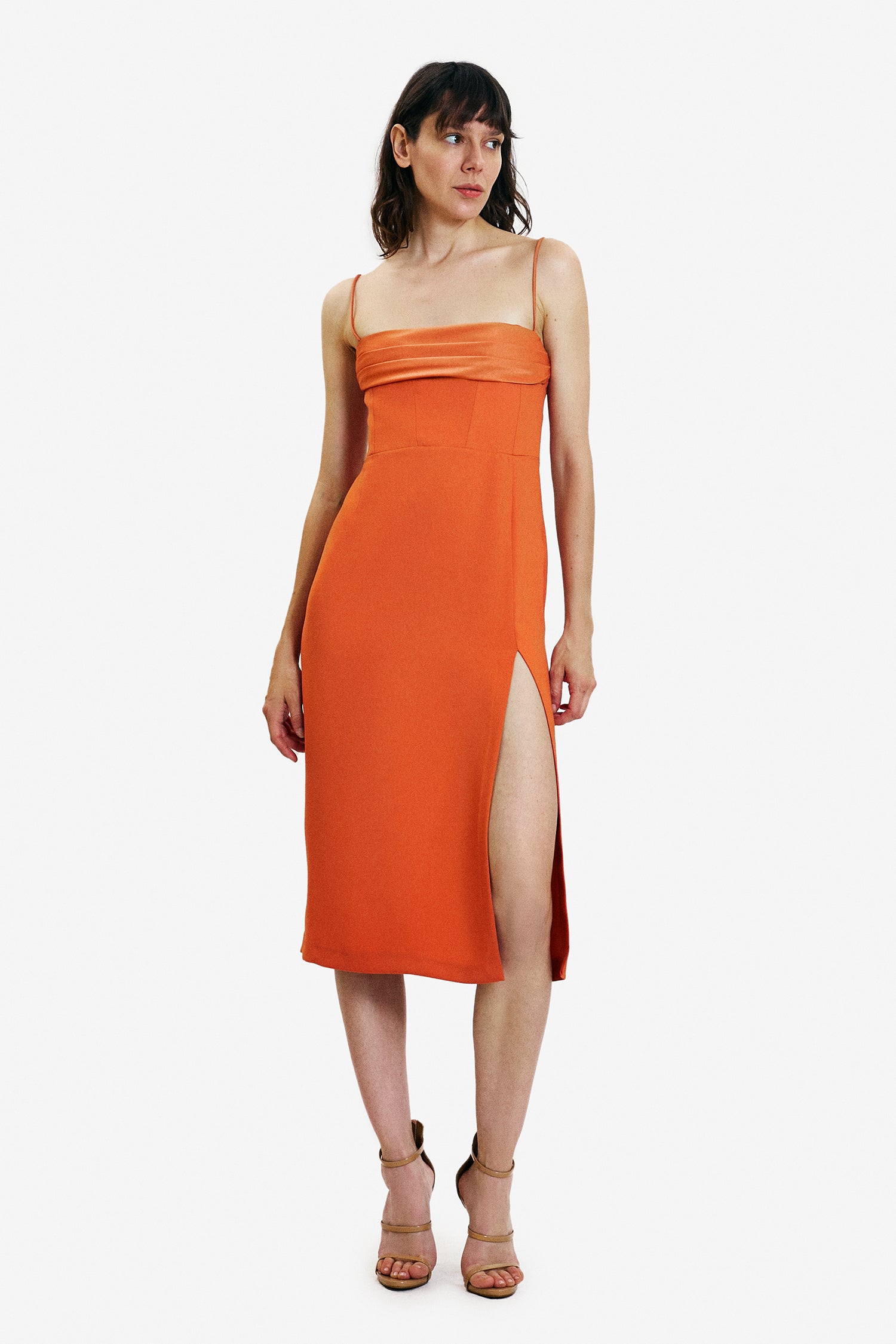 Looking for the perfect dress for a night out? Look no further than our Luisa Dress! With its delicate spaghetti straps and midi length, this dress will keep you cool and comfortable. The deep side slit and straight fit add a touch of elegance, while the ruched bodice flatters your figure. Don't miss out on this must-have dress!