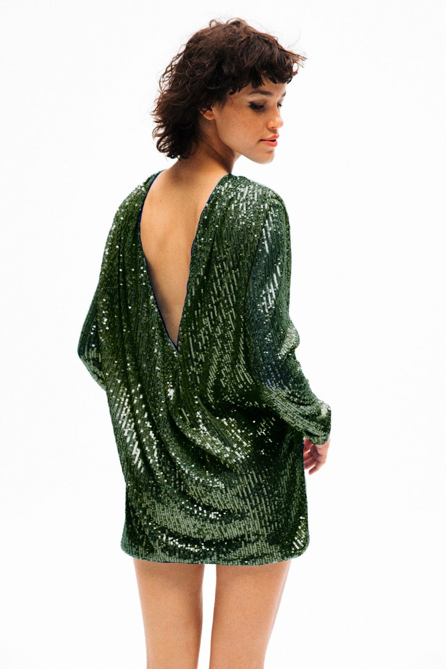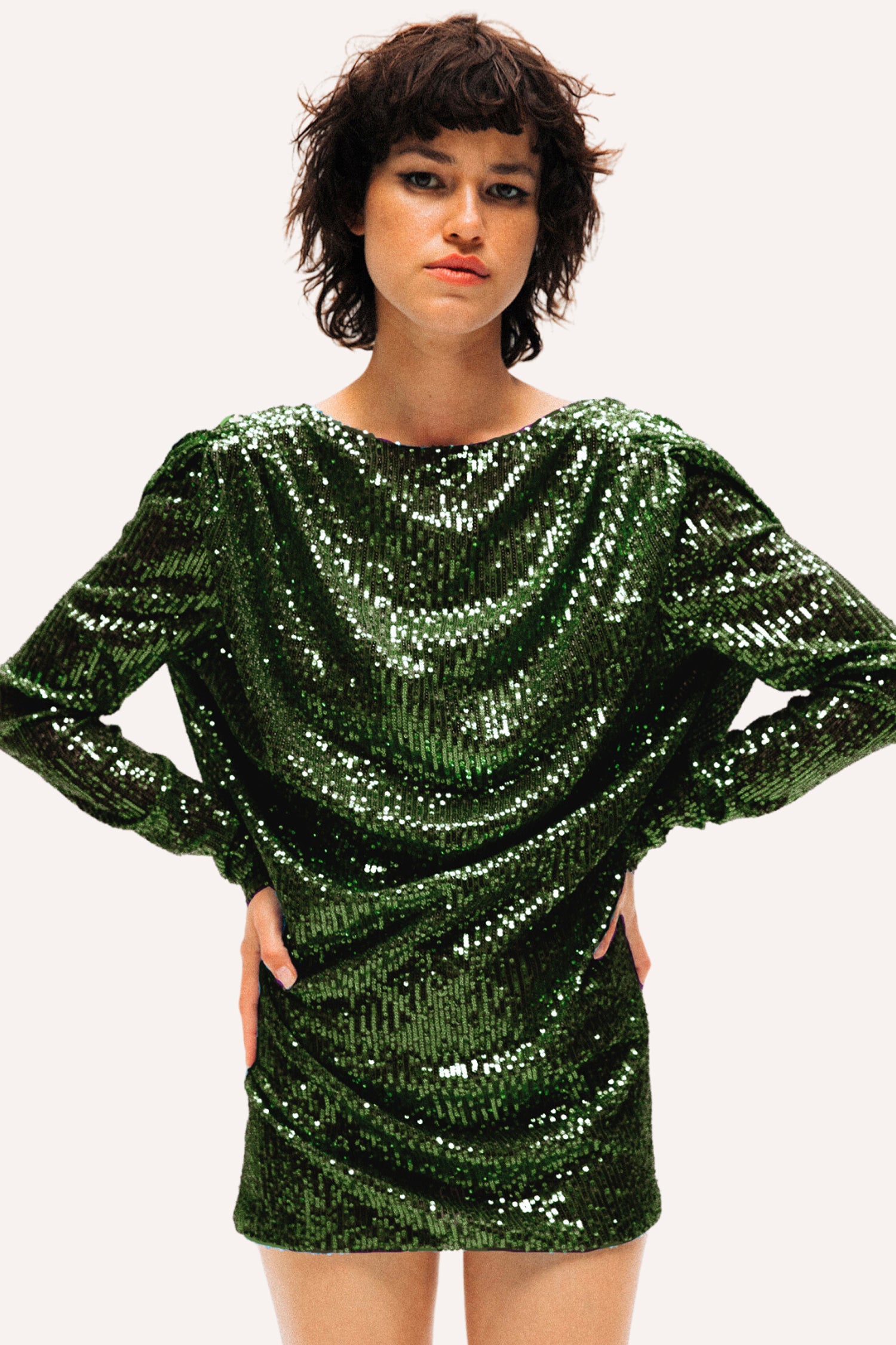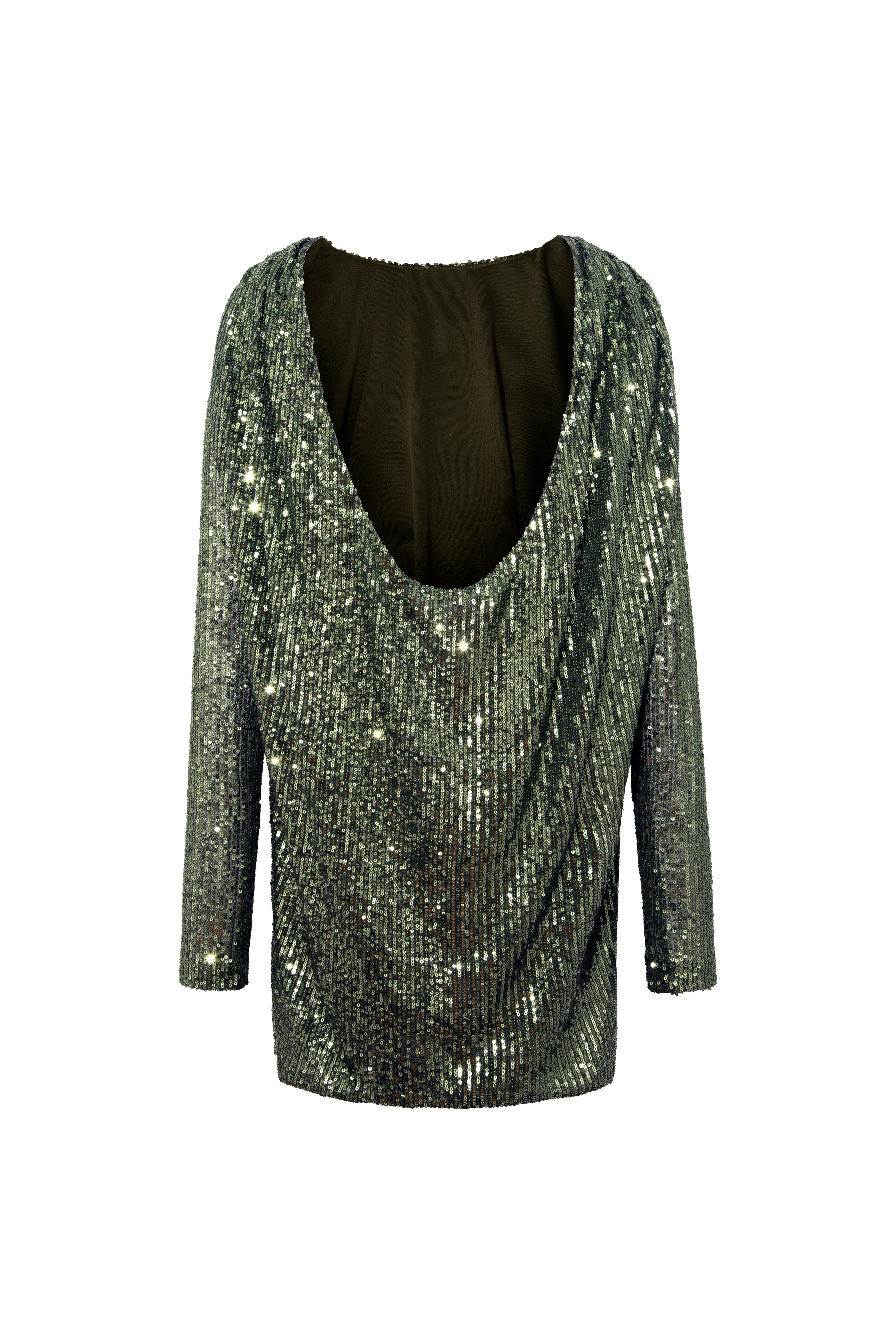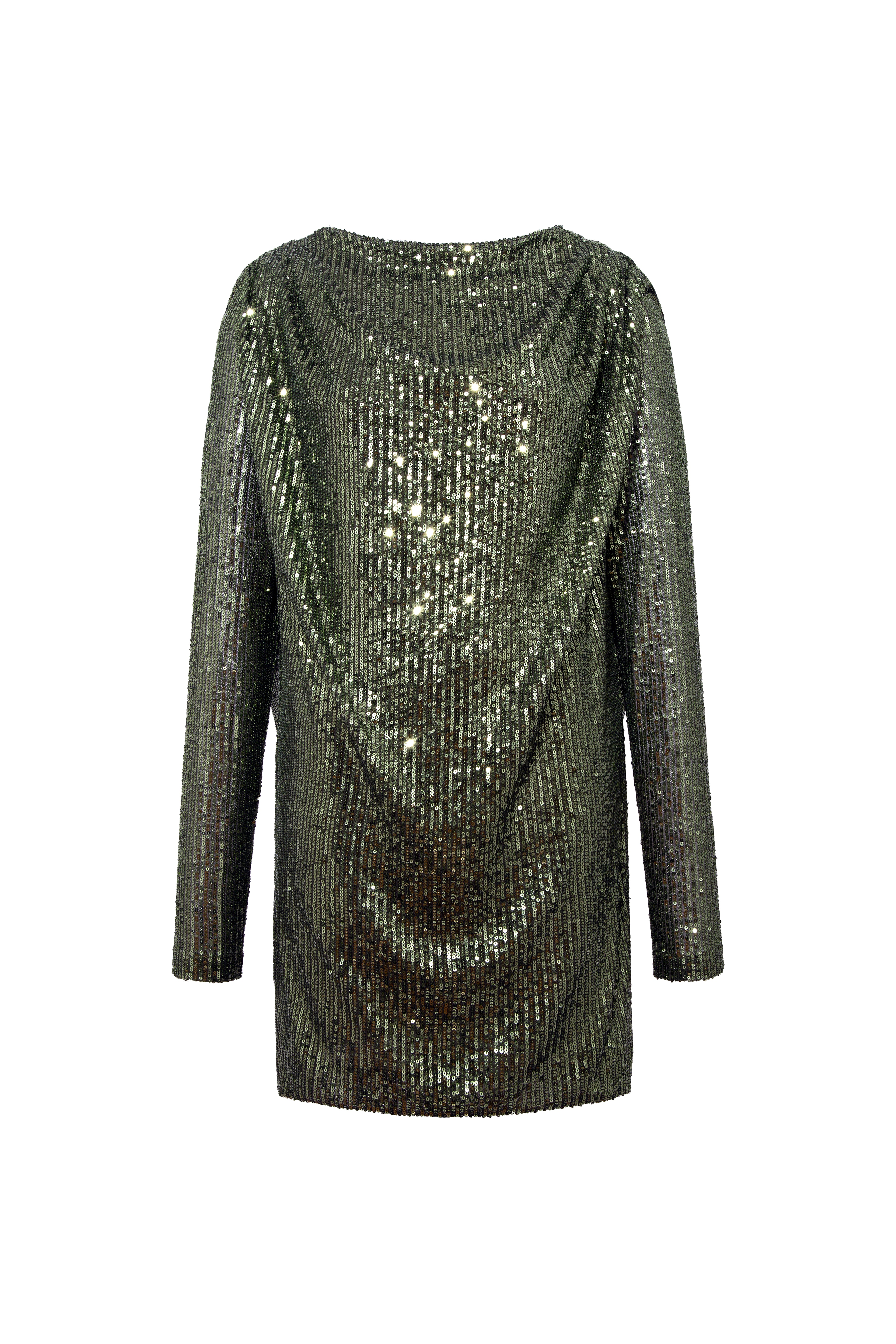 This mini dress features a bicycle neckline and long sleeves for a sophisticated look.