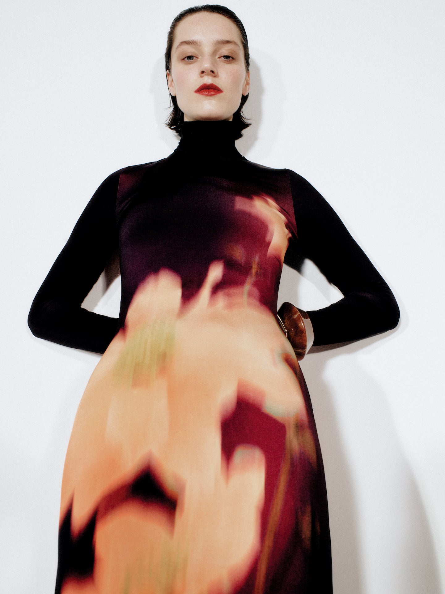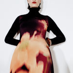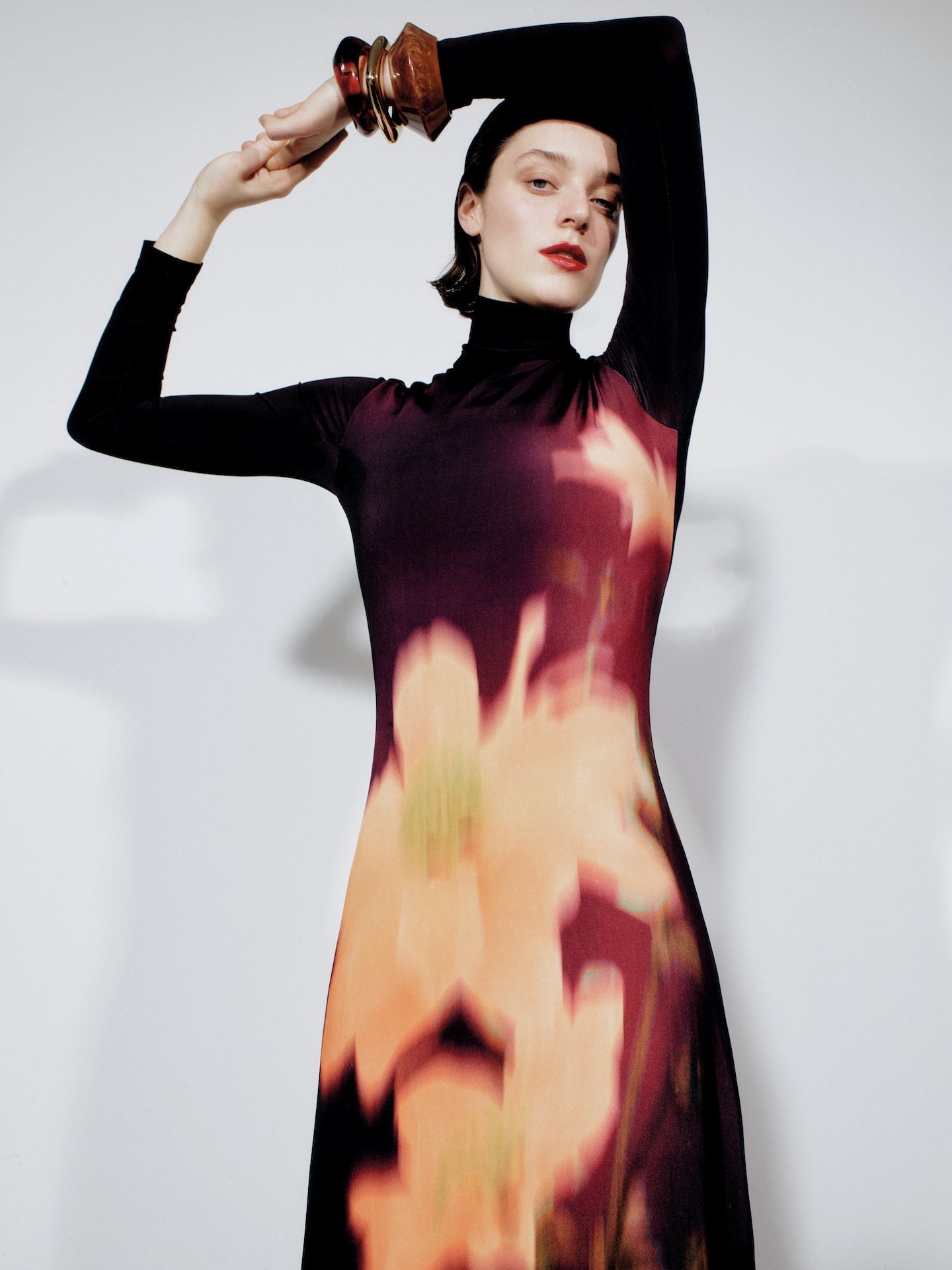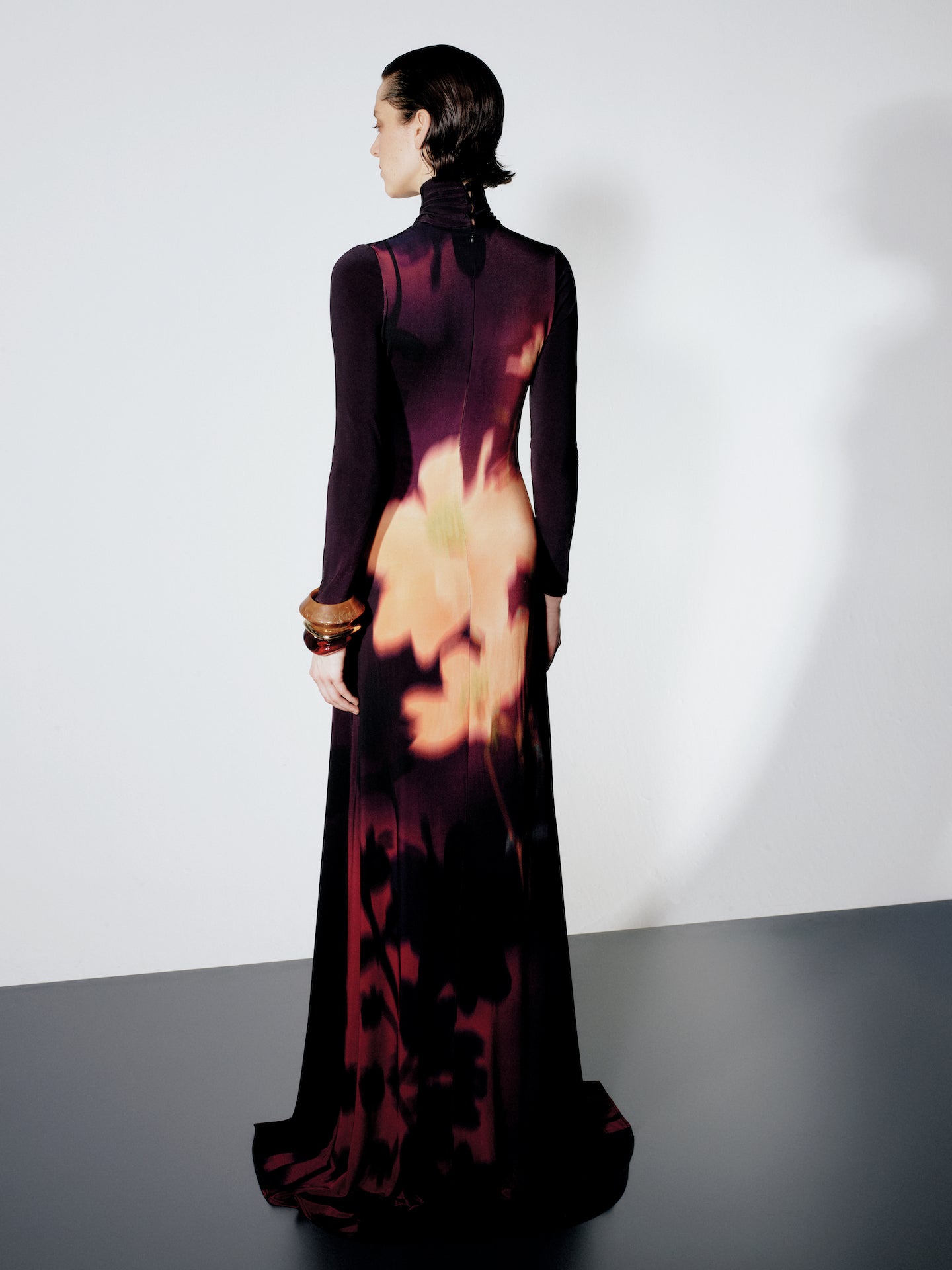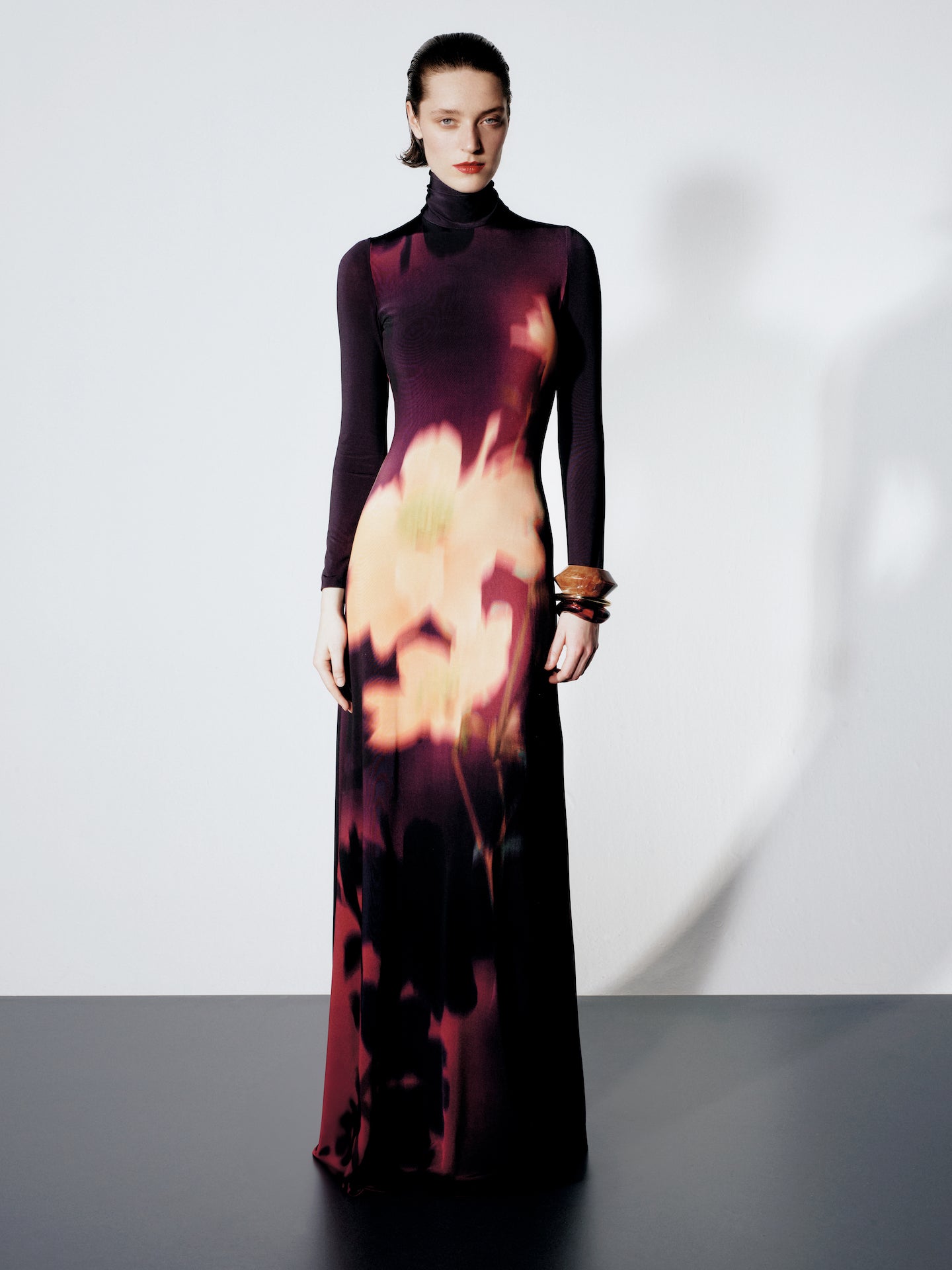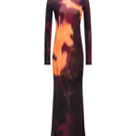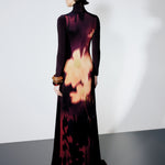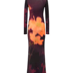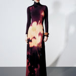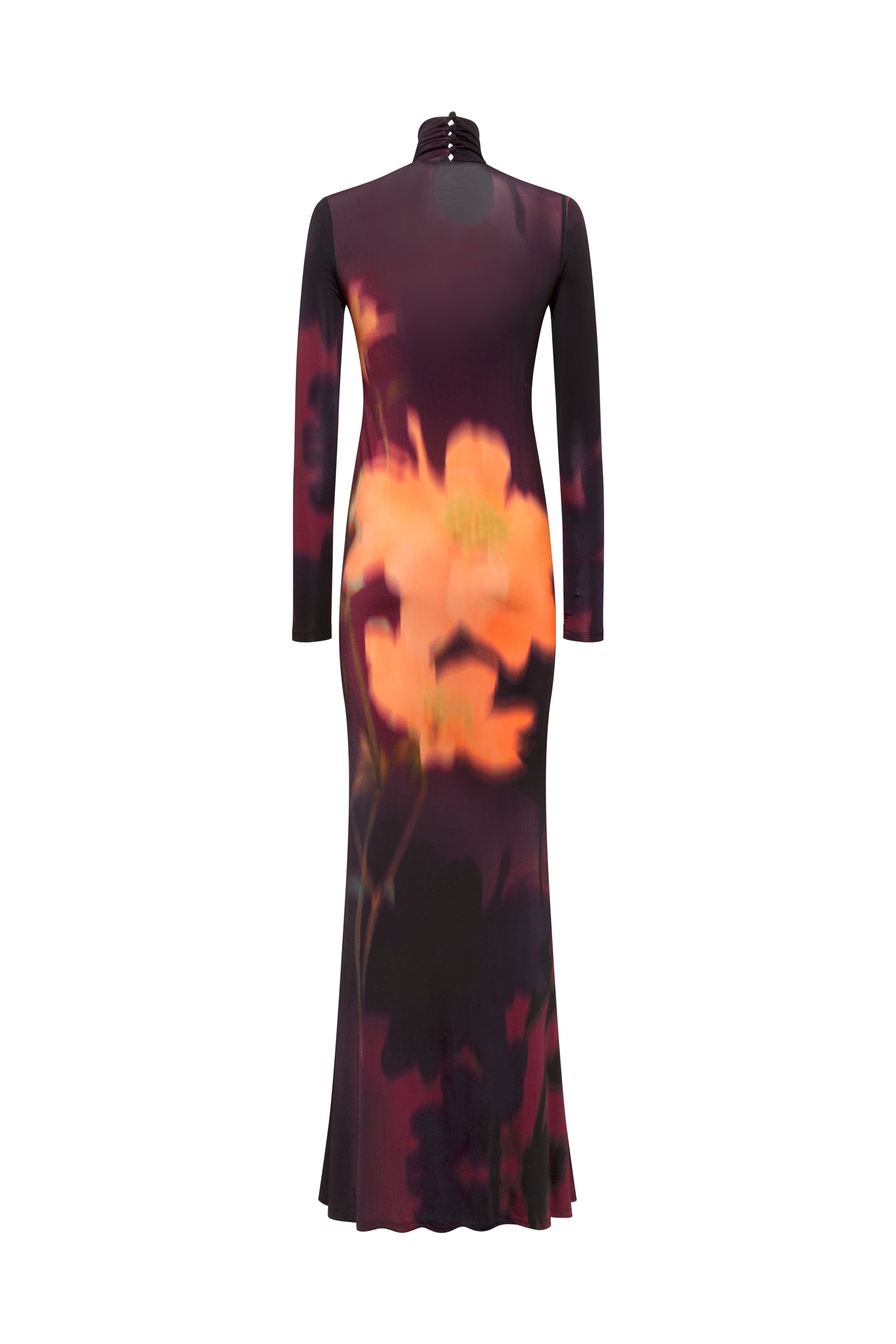 The Nova Maxi Dress features a floor-length design with long sleeves and a high neckline, creating a refined silhouette that flatters the figure. Its bold oversized floral print in rich purple, burnt orange, and yellow adds a vibrant yet elegant touch. Crafted from soft, stretchy fabric, this dress offers both comfort and a modern statement, perfect for sophisticated occasions.