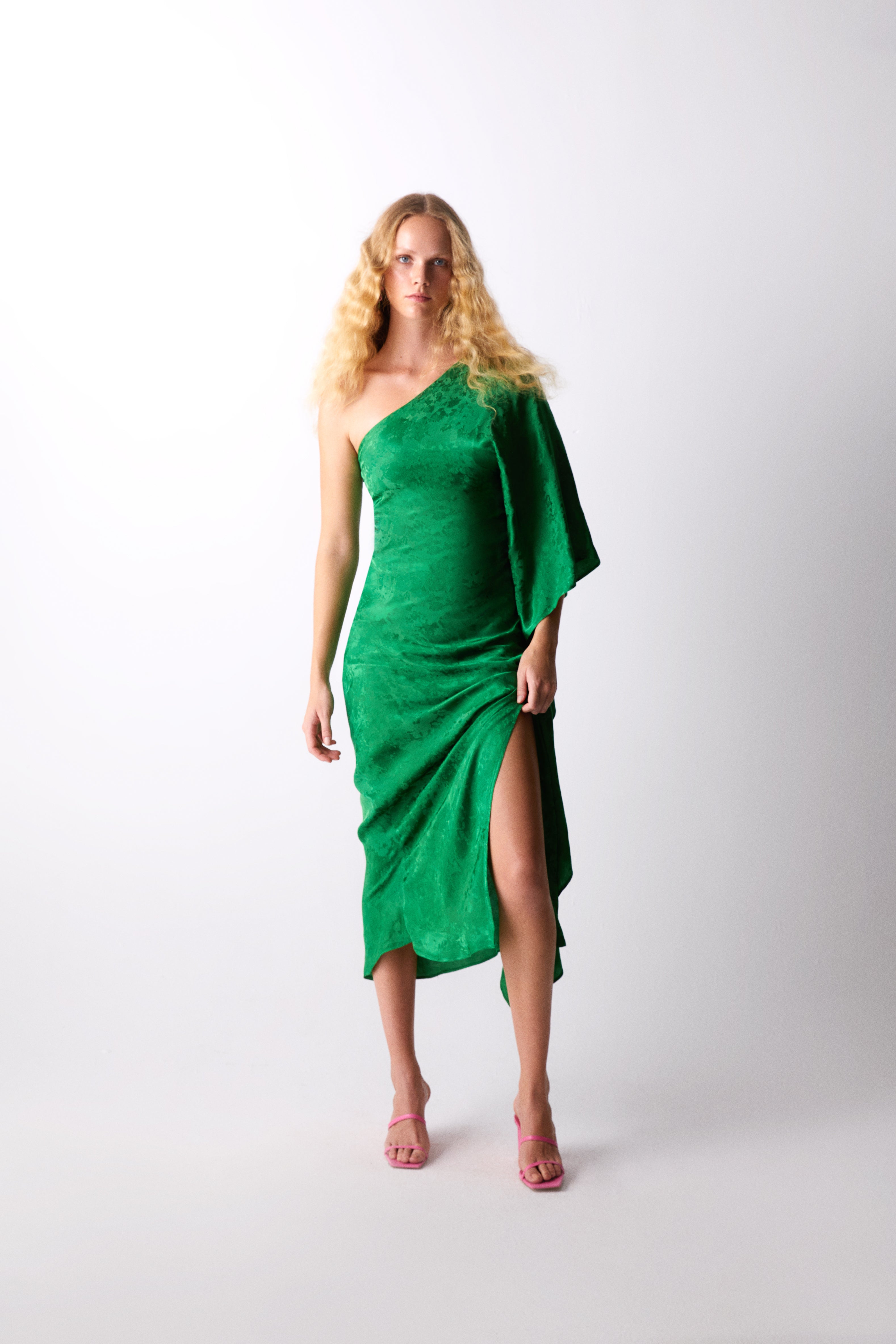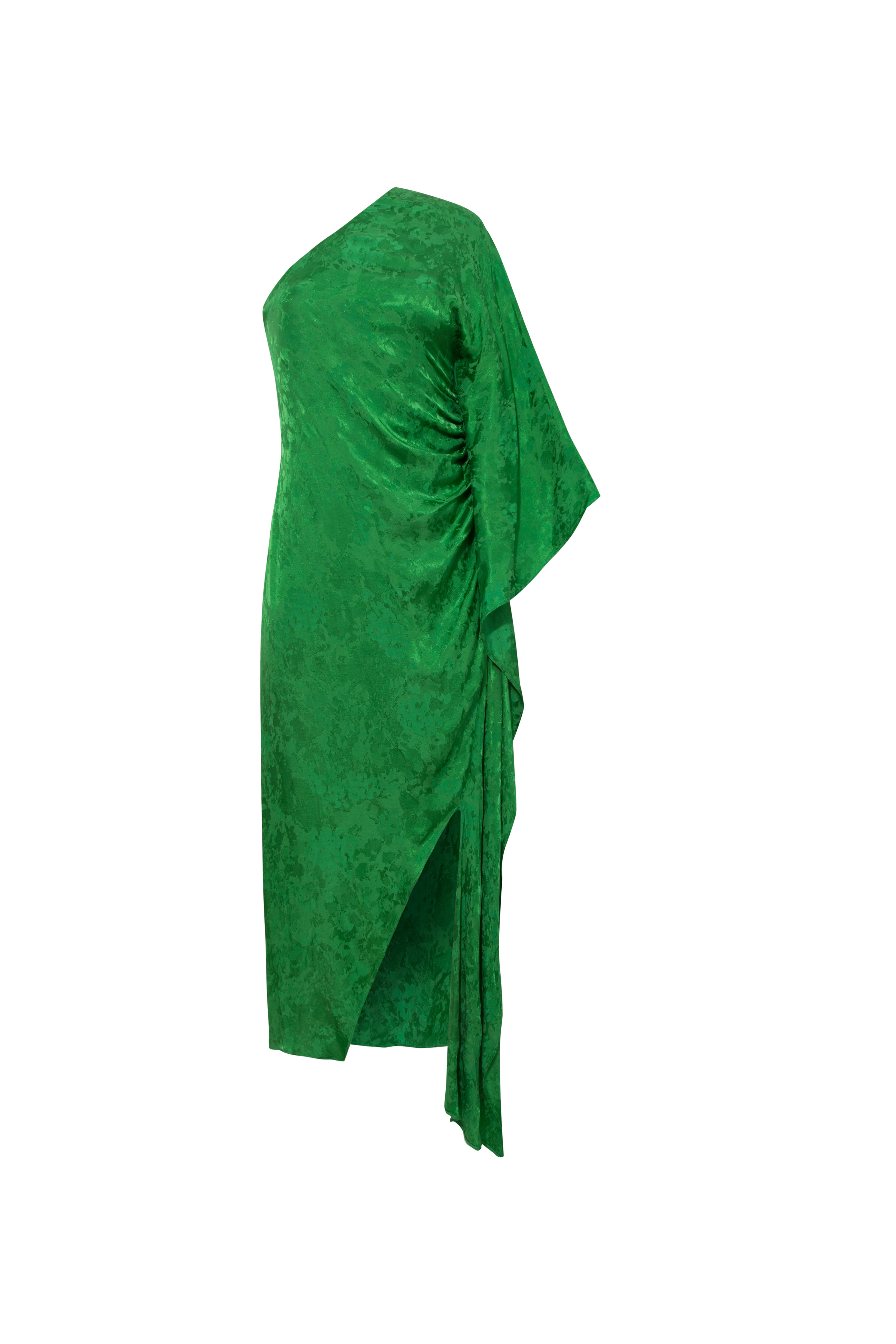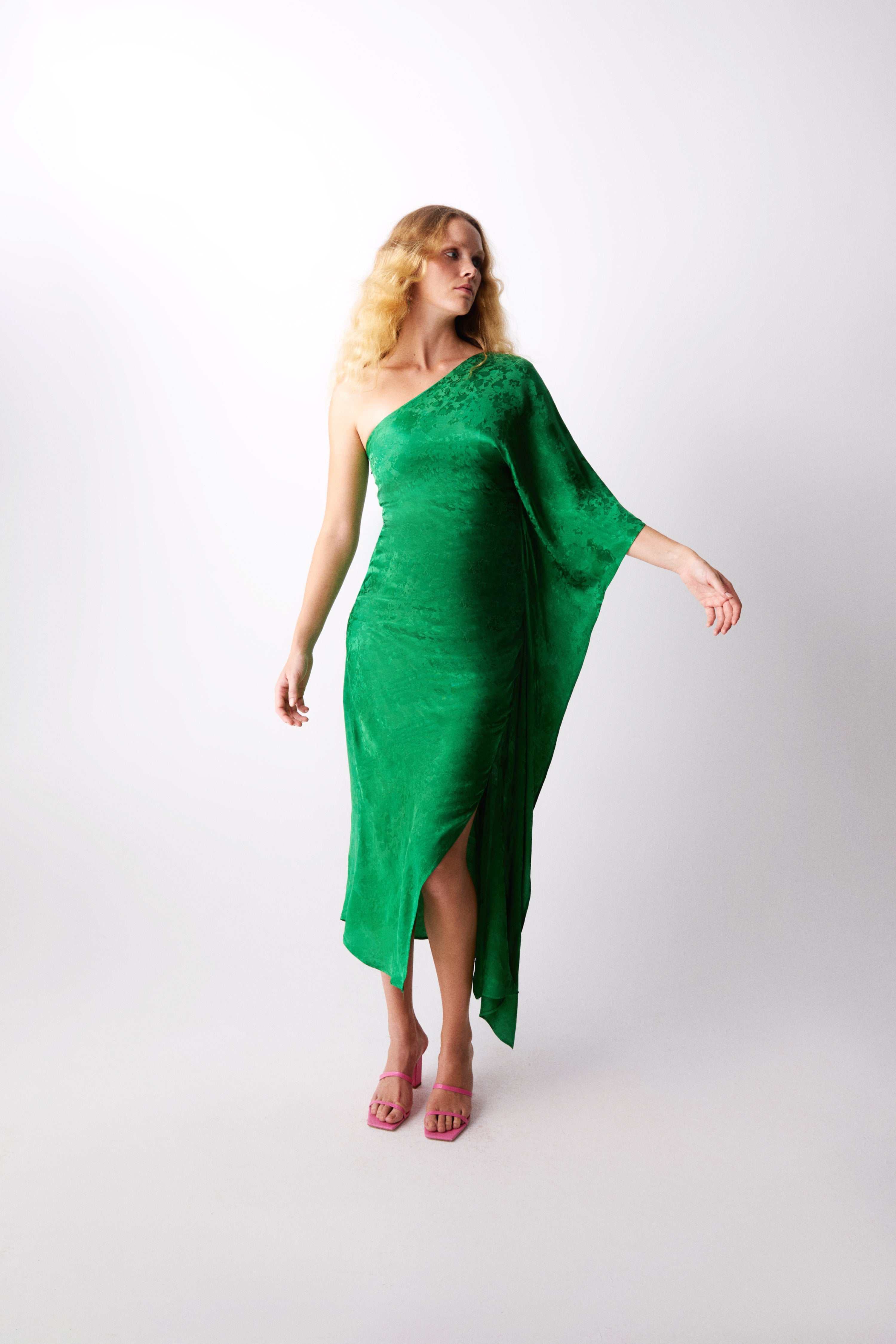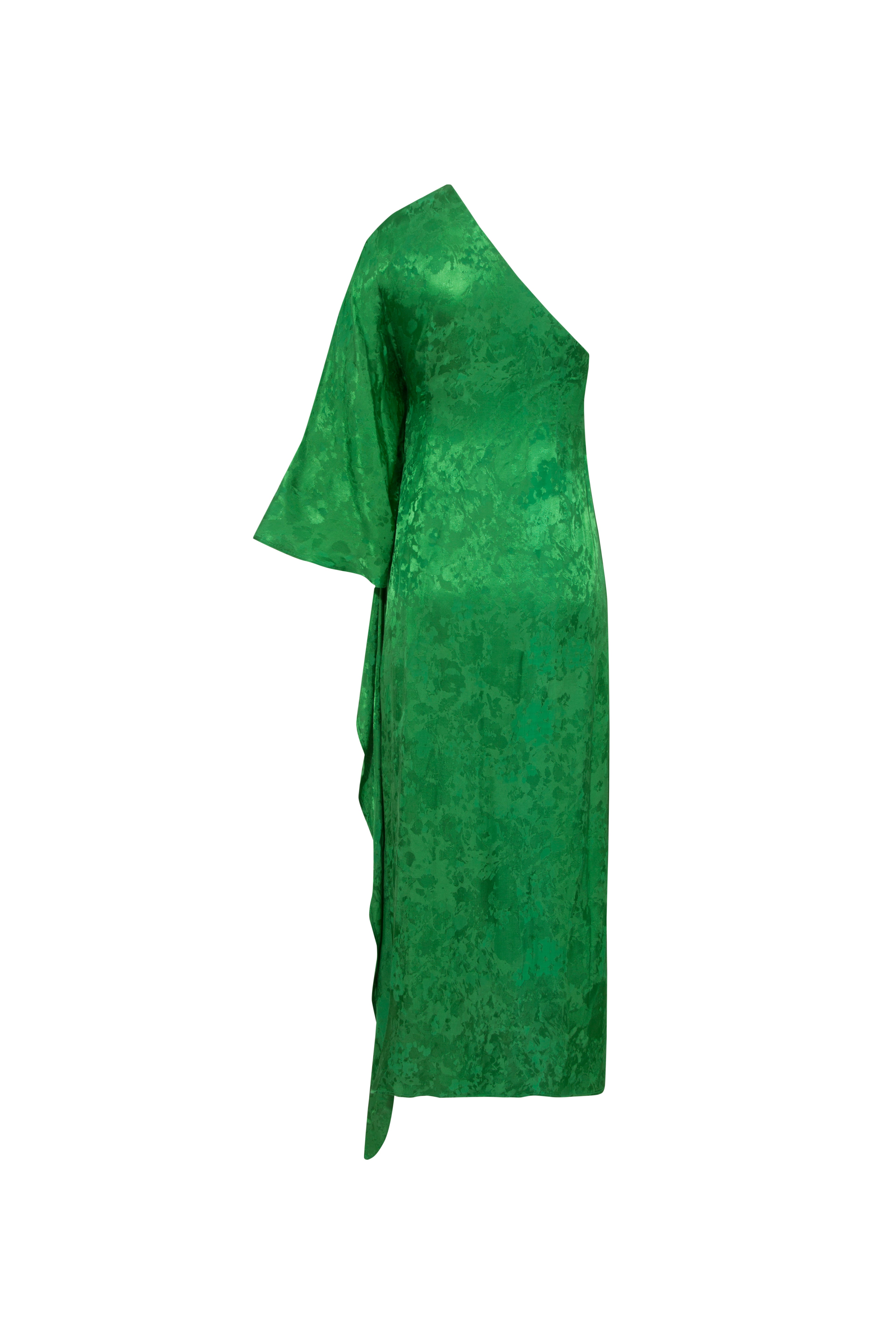 The Vittoria Dress redefines contemporary elegance with its unique single batwing sleeve and asymmetrical design. The single sleeves drapes languidly along the side and side split creating such pretty movement when you walk. Crafted from exceptional jacquard fabric, it exudes sophistication, enhanced by the vertical neckline. The fitted silhouette and flattering maxi length create a timeless appeal, while the hidden side zipper ensures a seamless finish and a comfortable fit.